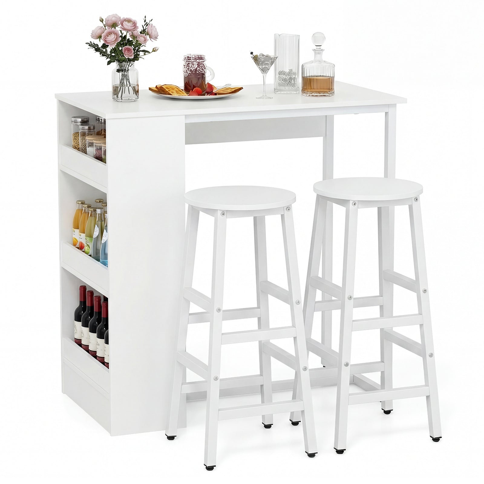 - Large Storage Space and Comfortable Footrest: With its spacious desktop, you can easily place rolls, cold cuts, and freshly squeezed orange juice on this kitchen bar table. The 3-layer side shelf provides you with sufficient space for storage and decoration. Besides, footrests are built to relax your legs leading the way for an enjoyable chatting time.