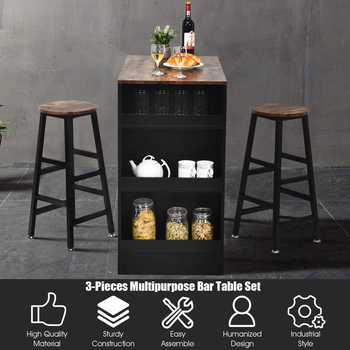 - Multifunctional Bar Set: This industrial bar table set features classic colour, clean lines and open design that can perfectly match with any room decor. These bar stools are adopted with round seats, allowing you to sit comfortably. Apart from serving as a bar set, it can also serve as a dining set to have breakfasts.