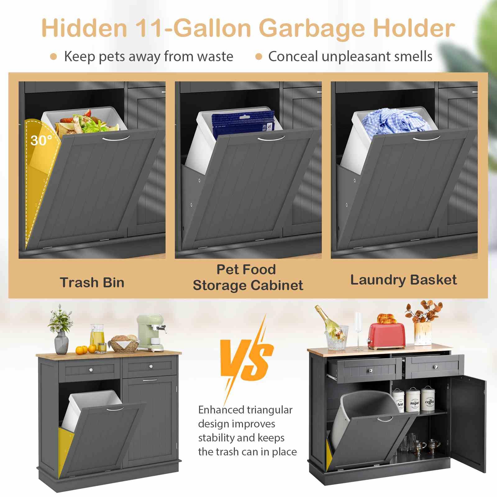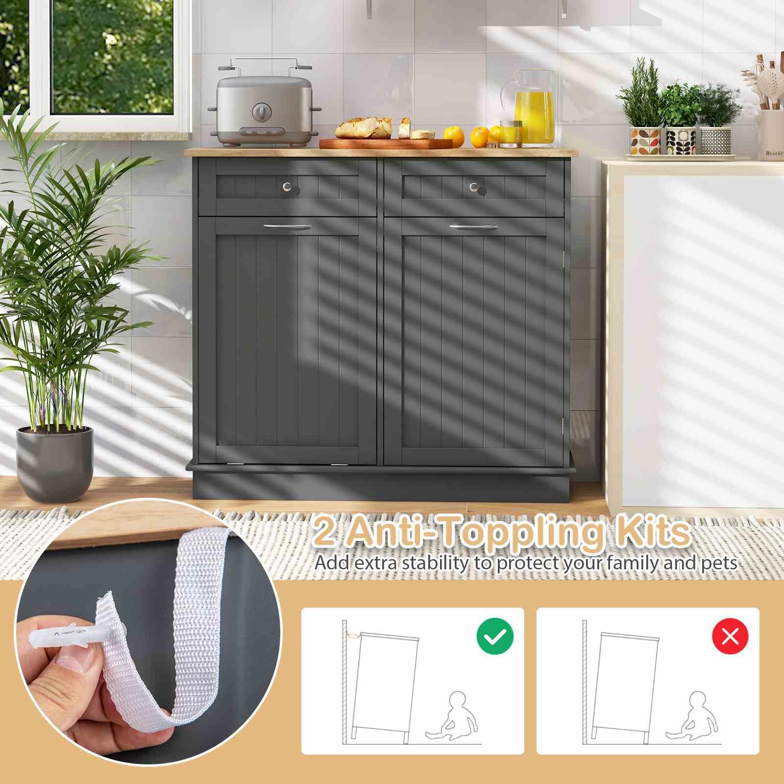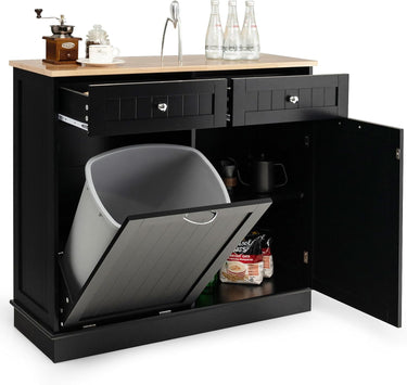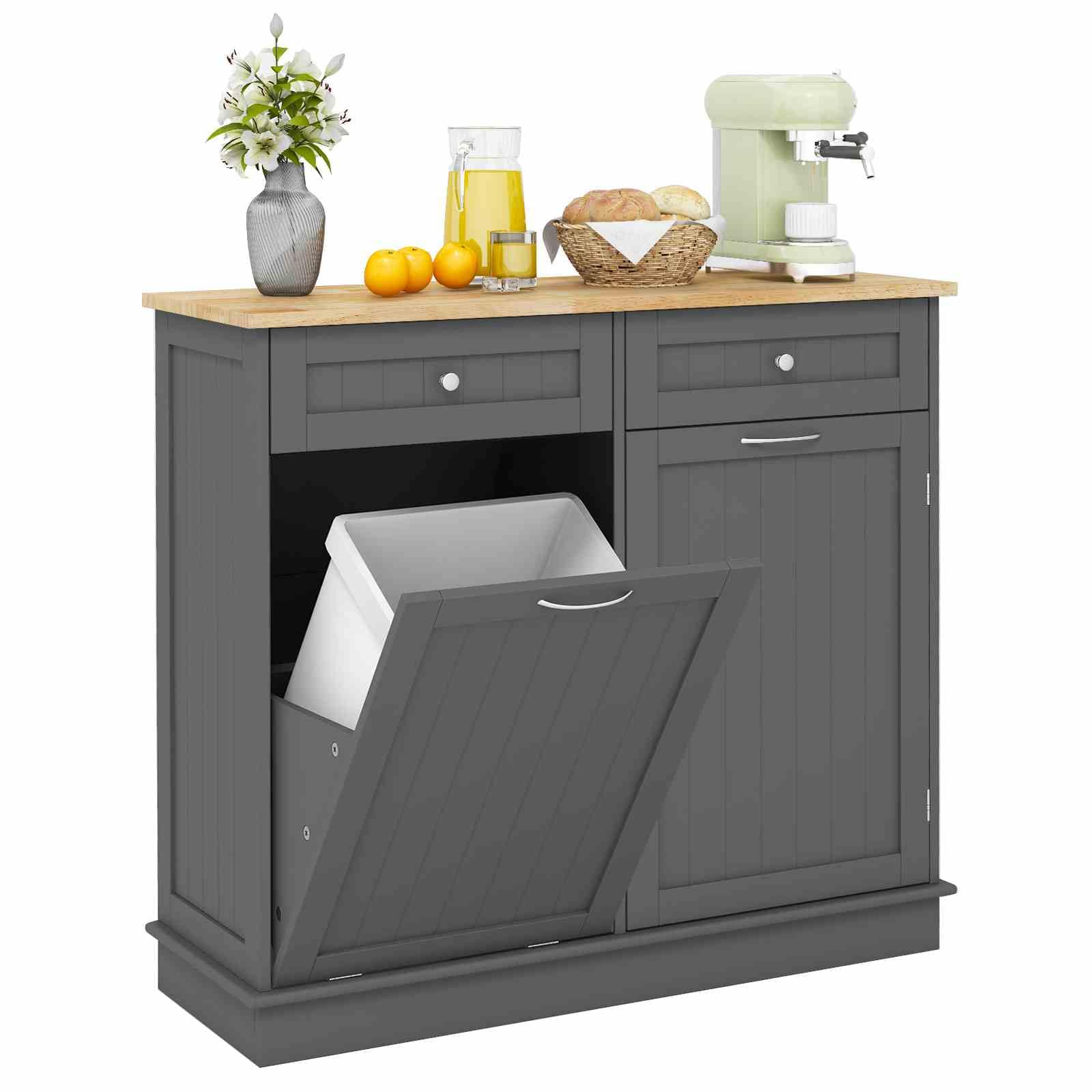 Give your home a stylish way to hide your trash can with our tilt-out trash cabinet! This trash cabinet has a solid rubber wood tabletop with ample room to display kitchen appliances and prep your food. It features a tilt-out door that elegantly accommodates waste bins of 38L. This single trash can cabinet is also designed to store your dirty clothes and organize your pet supplies. The enclosed cabinet has a 3-position adjustable shelf with capacious storage to hide your clutter. The 2 drawers also provide organizing spots for silverware and utensils. This kitchen island with trash can holder has a strong MDF structure that lasts for quite a long time to provide you with great service.