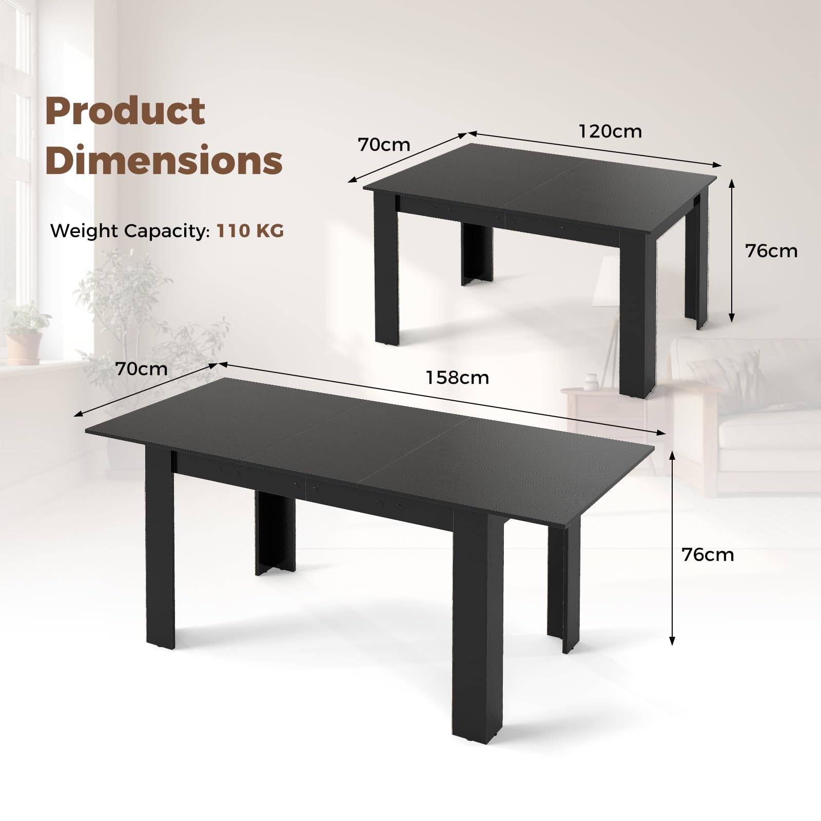 Our expandable dining table is designed to accommodate 4-6 guests with ease. Its adjustable length, spanning from 120cm to 158cm, offers the flexibility to personalize your dining space for any occasion. The large tabletop is perfect for storing food items, tableware, plants, and decorative accents, making it an ideal centerpiece for any dining area. Thanks to its classic design and practical expandability, this table seamlessly transitions from a family dinner in the living room to a formal dinner in the dining room or a business meeting in the conference room. Besides, constructed with robust L-shaped legs and premium wooden boards, it supports up to 110 kg, ensuring long term daily use. Te table's smooth surface is easy to clean with a damp cloth, and its overall dimensions of 158 x 70 x 76cm (L x W x H) make it a practical and stylish addition to your home.