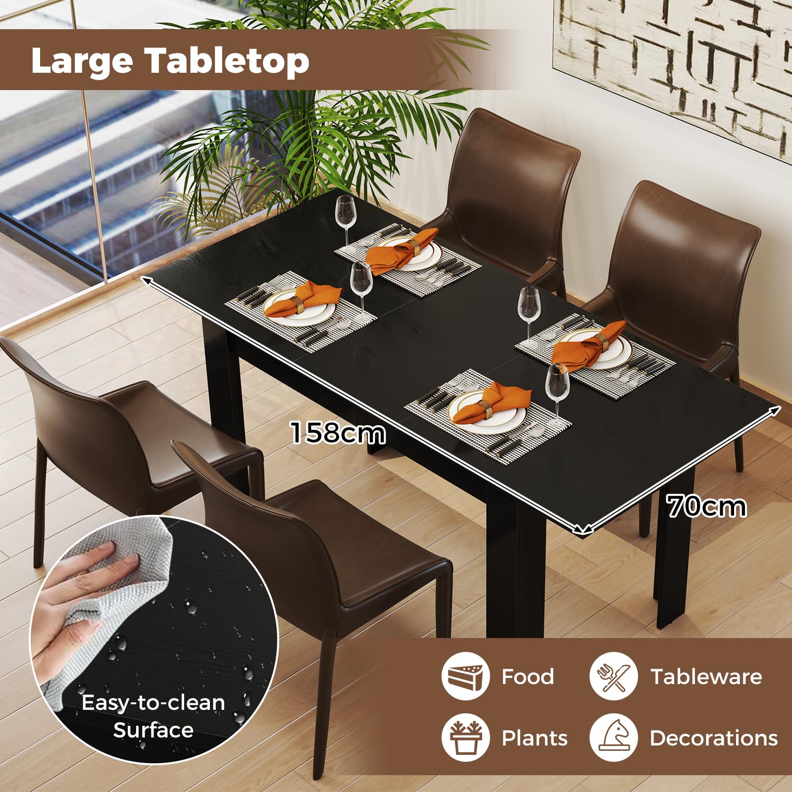 Expendable Tabletop: This versatile table boasts an expandable design that allows you to personalize the size of your desktop. The length can be adjusted from 120 cm to 158 cm, which makes it perfect for accommodating 4-6 guests.