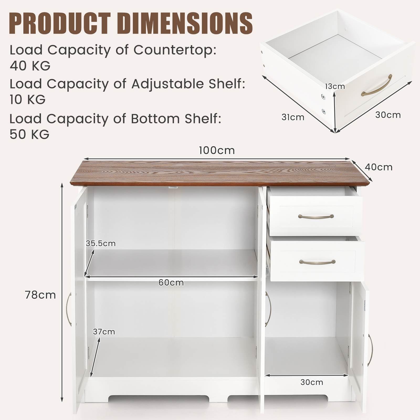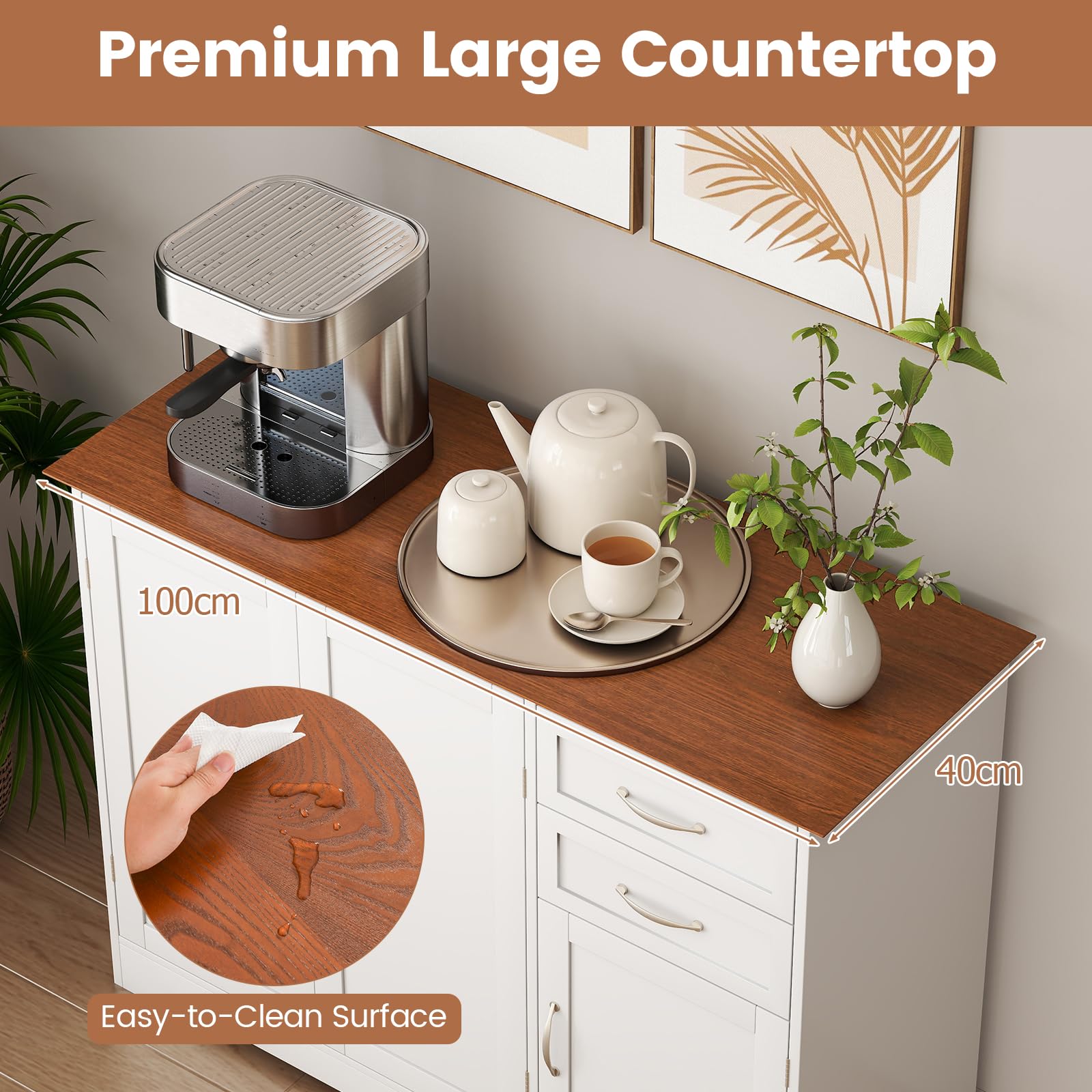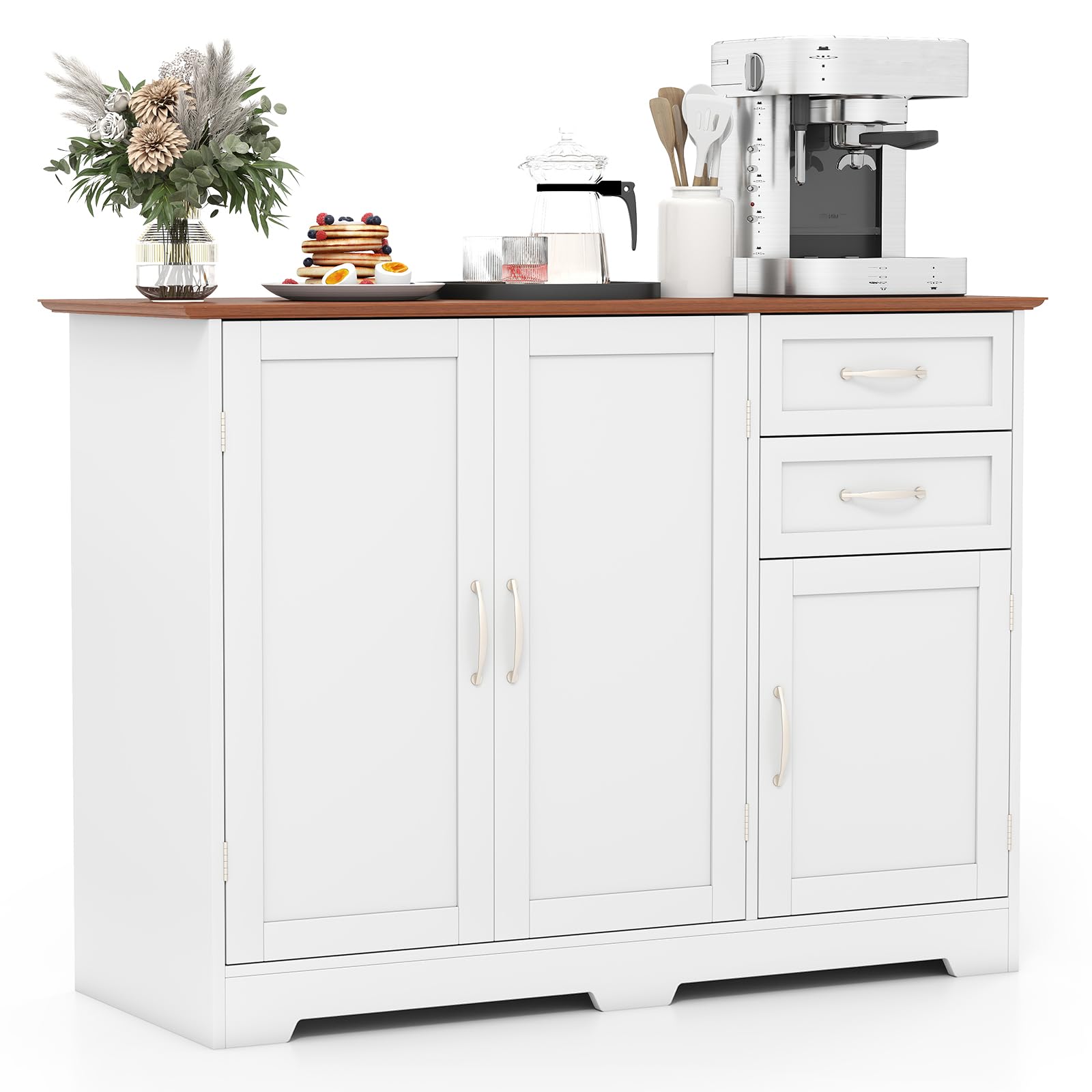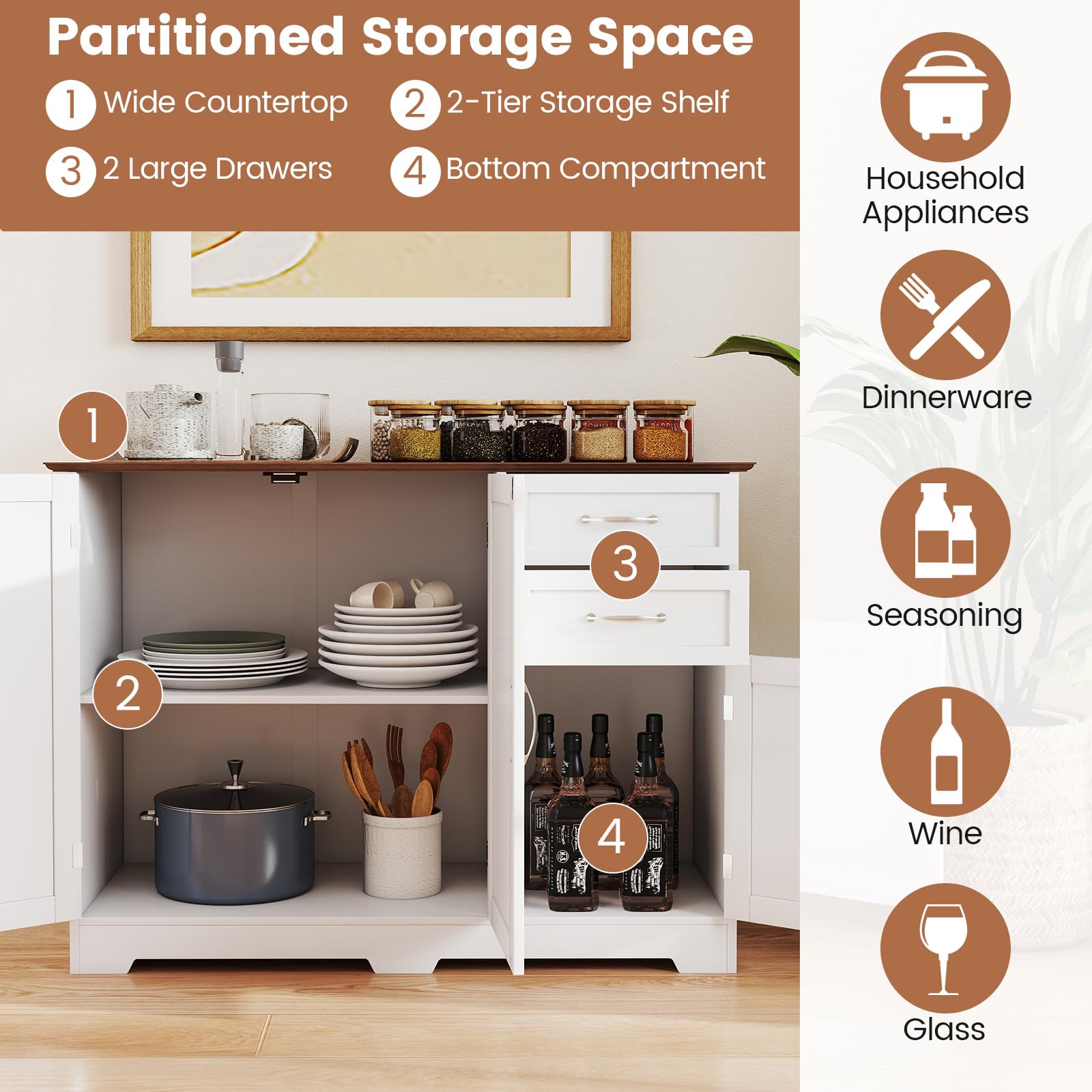 Ample Storage Space: Featuring 2 large drawers, 2 storage cabinets and a wide cabinet top, this storage cabinet provides ample storage space for household appliances, dinnerware, kitchenware, seasoning, wine and glass.
