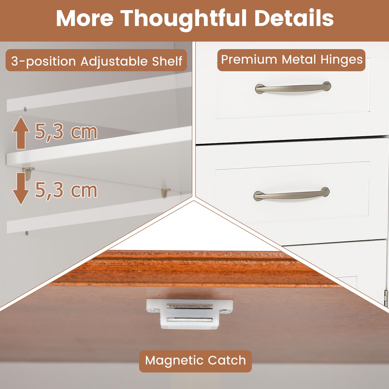 Adjustable Design and Thoughtful Details: This storage cabinet comes with 3-position adjustable shelf which is suitable for different sized items storage, and with metal handle and magnetic catch for you to easy open and close the caninet door.