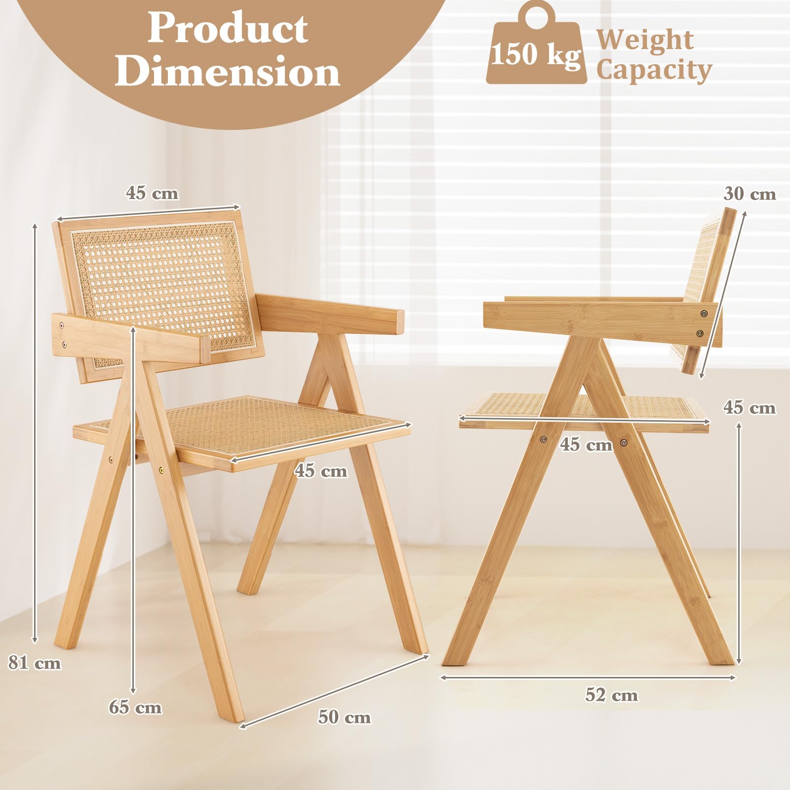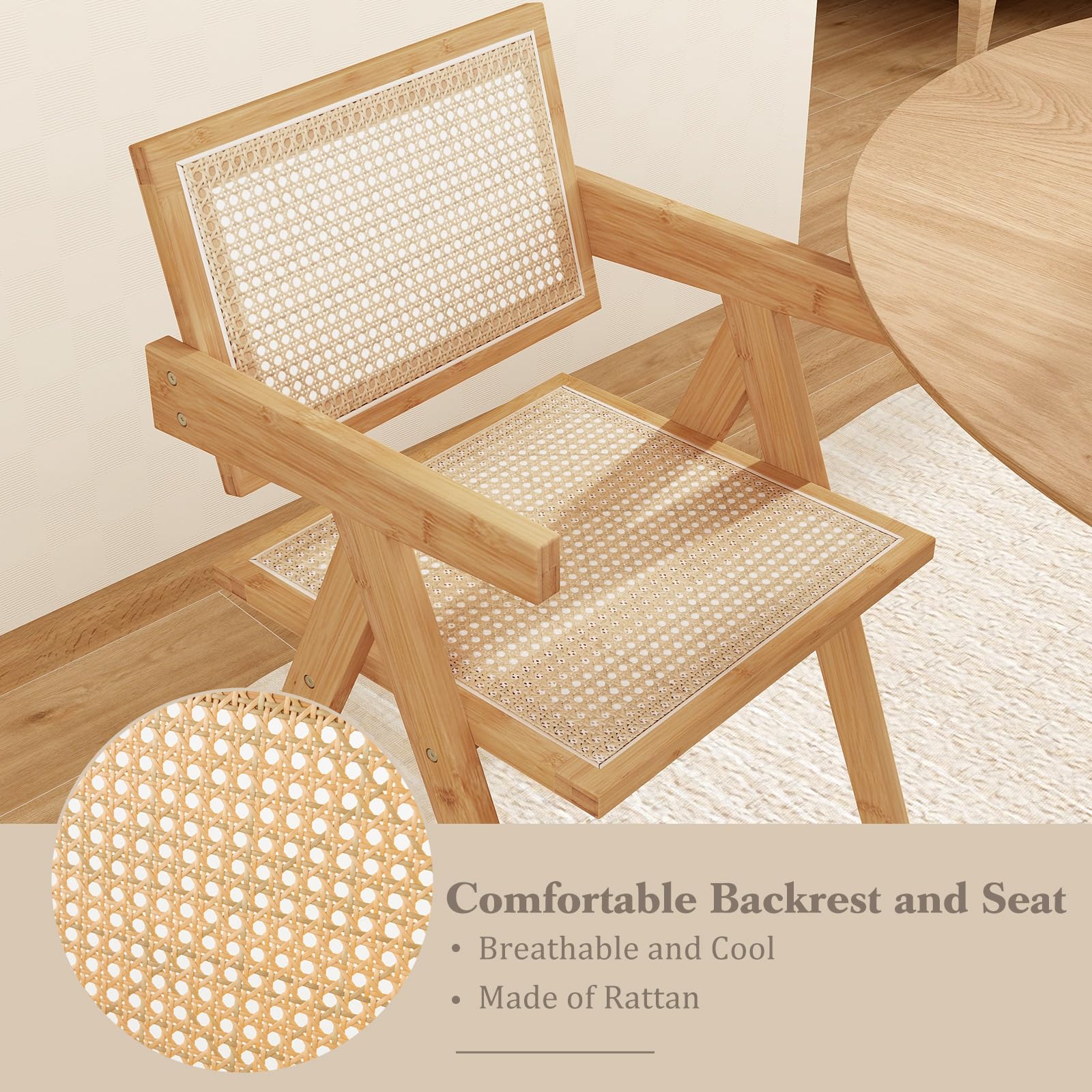 Constructed from sturdy bamboo, this cane kitchen chair offers both durability and natural elegance. The breathable and cool rattan backrest and seat provide a comfortable seating option, perfect for warm climates and long periods of sitting. With comfortable armrests, this rattan dining armchair enhance relaxation. The reinforced cross bars and anti-slip foot pads increase steadiness. Serving as a perfect addition to any dining space, this mid=century modern chair effortlessly complements the kitchen, dining room, living room, or restaurant.