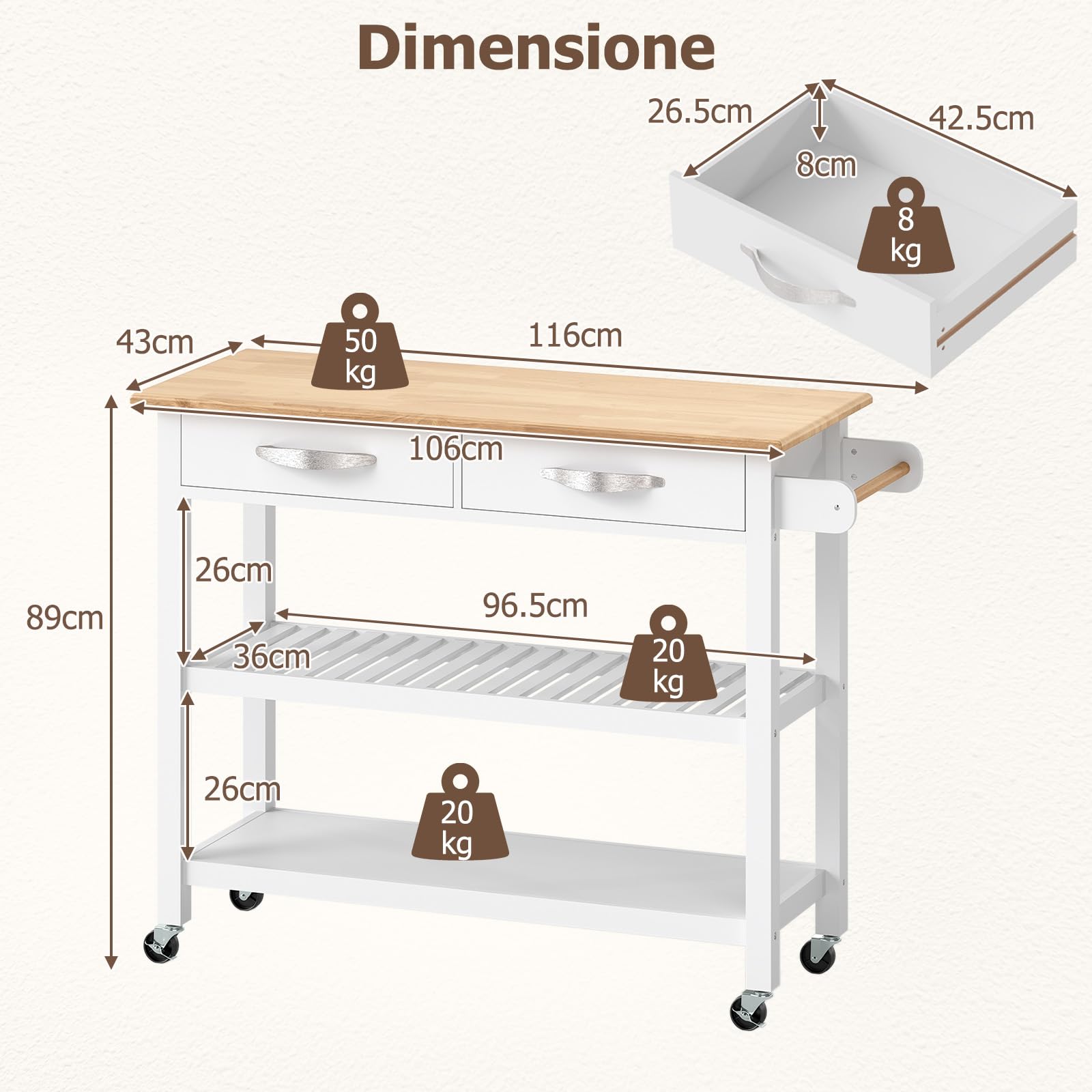 Spacious Countertop: This kitchen island features a generous 106 cm x 43 cm wooden countertop that provides ample space for preparation or serving. The easy-to-clean surface enhances your space's functionality.