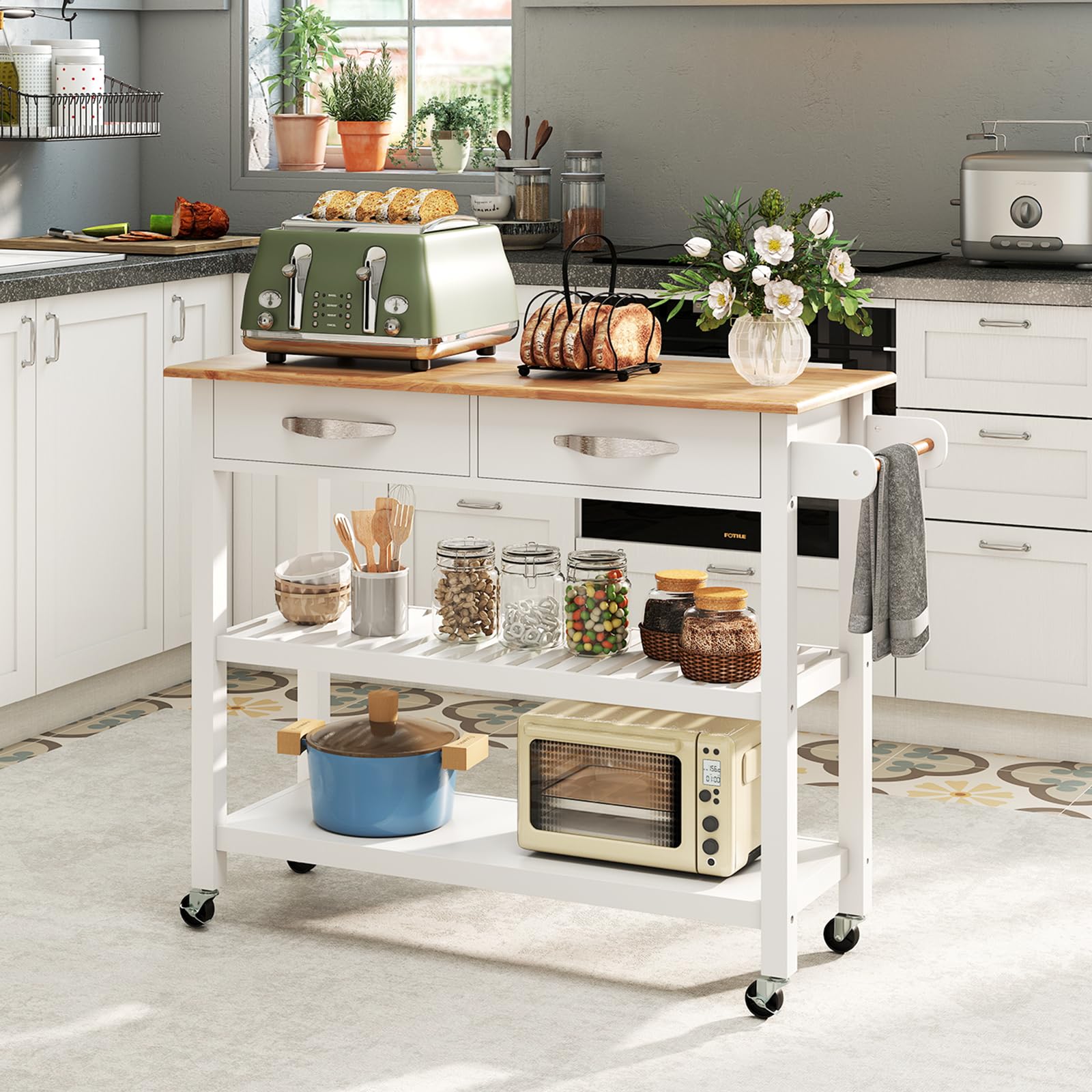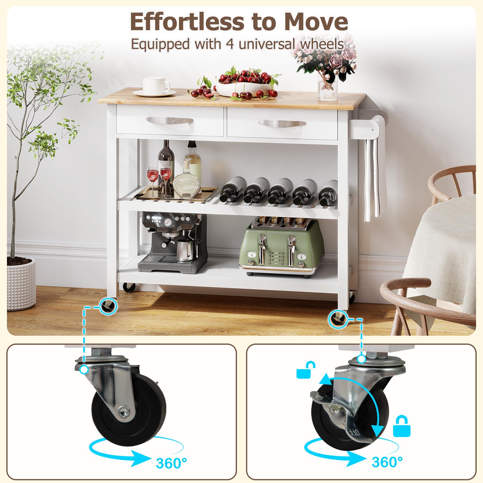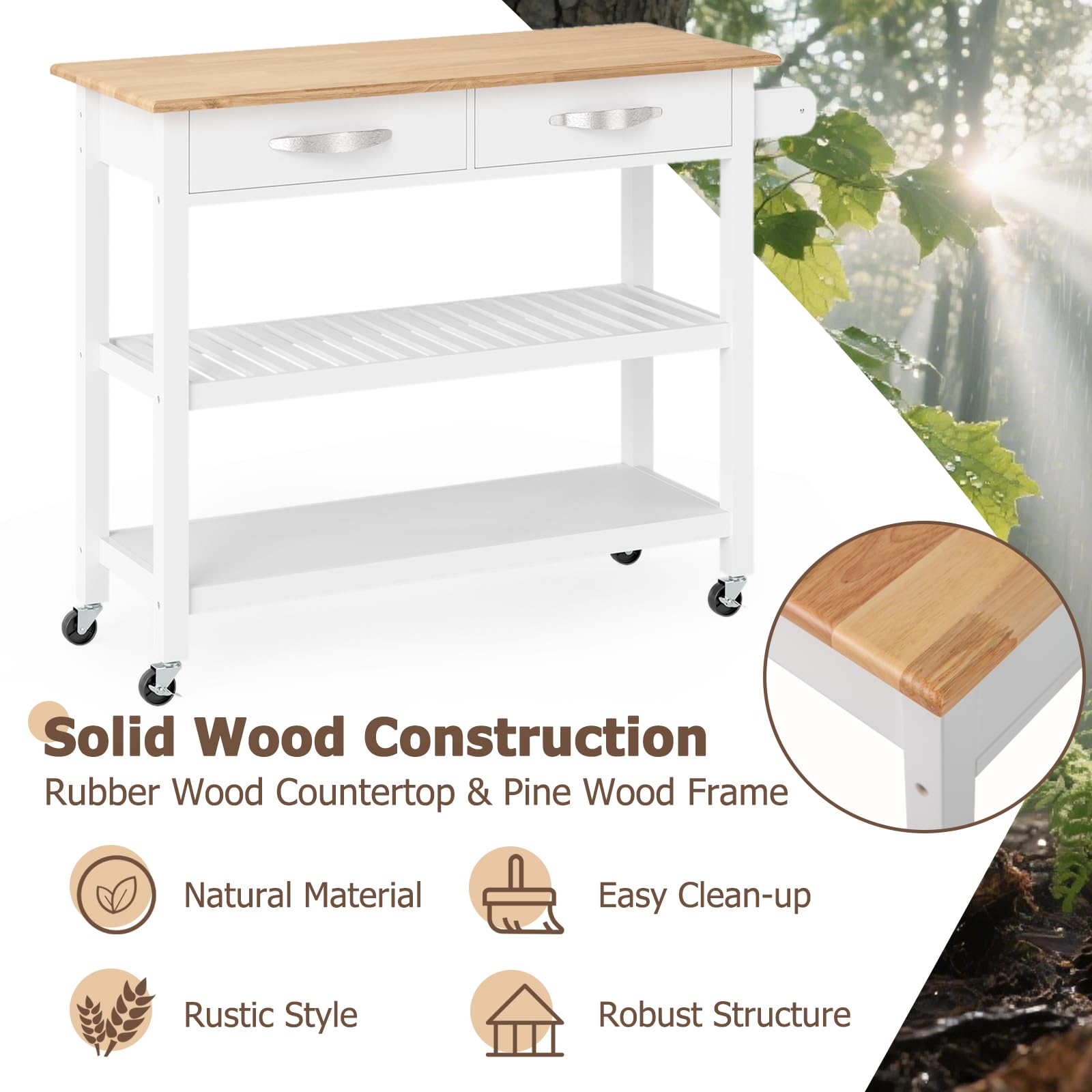 The spacious wooden countertop provides ample room for prep or serving, while the 2 drawers and 2 shelves offer extensive storage for kitchen essentials, keeping everything organized and accessible. Crafted with a rubber wood top and pine wood frame, this kitchen rolling cart ensures durability and stability. The mobile design with 4 universal wheels, including 2 lockable ones, allows easy transportation between kitchen and dining areas.