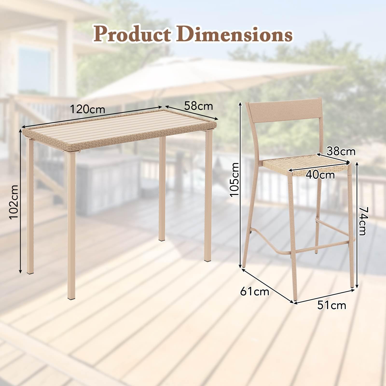 The metal tabletop of the patio bar table set features wood finish, exuding a rustic charm. Designed with a breathable weave pattern, the rattan seat offers a comfortable seating experience even on hot summer days. The light brown PE rattan gives them a classic yet modern look. Moreover, the gently tilted backrest and footrest will enhance your comfort level. The set of 2 bar stools feature robust metal frames that can support up to 160 kg, making them sturdy and reliable for everyday use. The anti-slip footpads provide additional safety, while the reinforced beams enhance stability. Need extra space when the barstools are not in use? The stackable design allows you to conveniently store them away, saving valuable space and making them ideal for smaller outdoor areas. The elegant appearance of these barstools adds a touch of sophistication to any outdoor setting, whether it's your porch, garden, or poolside area.