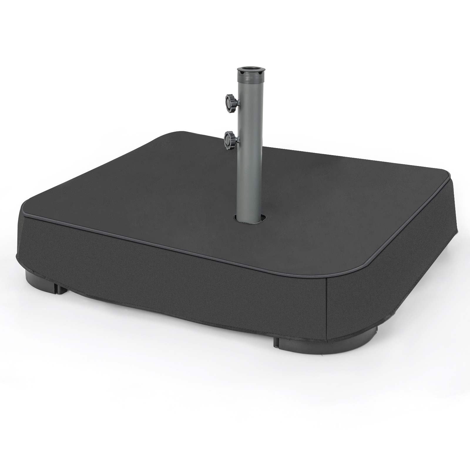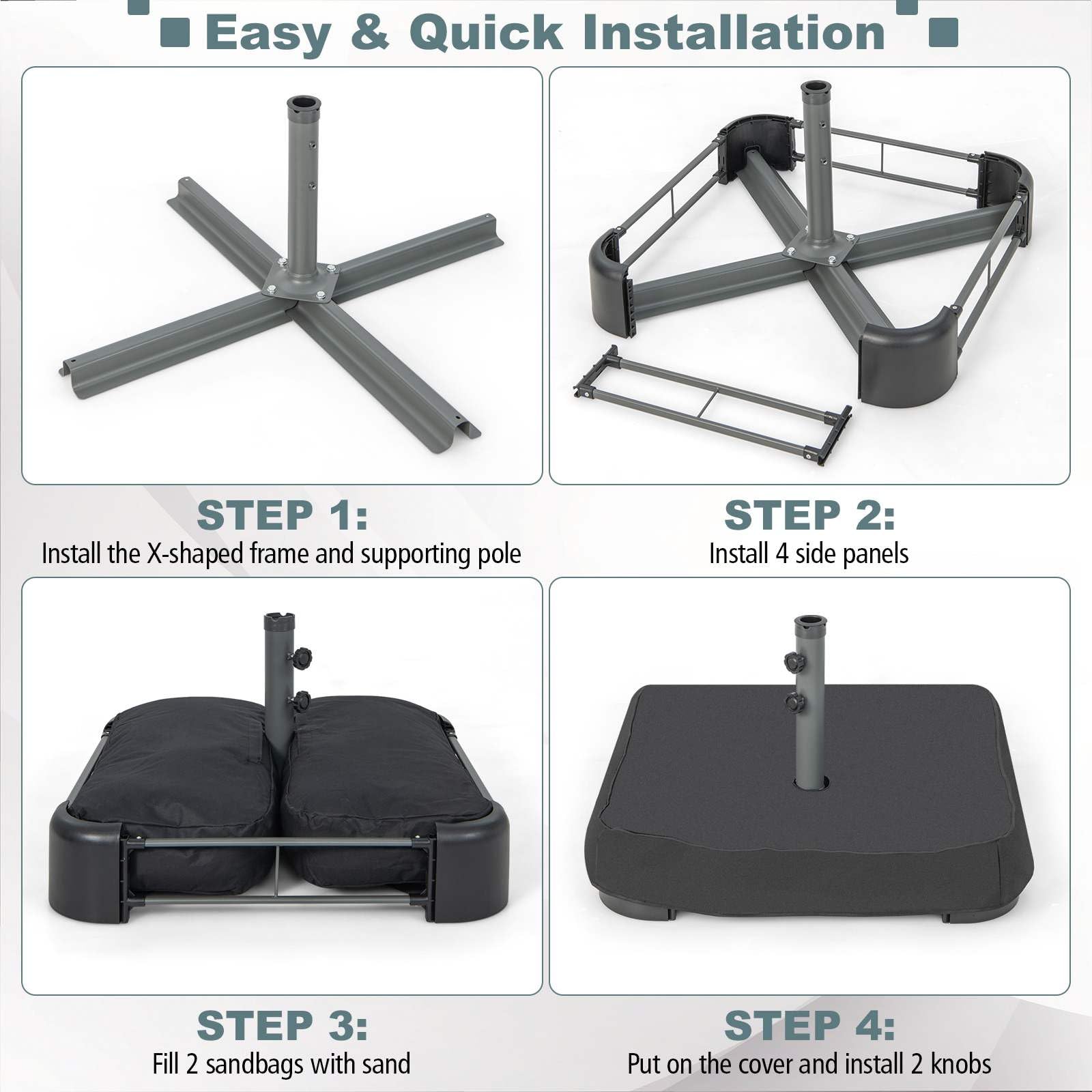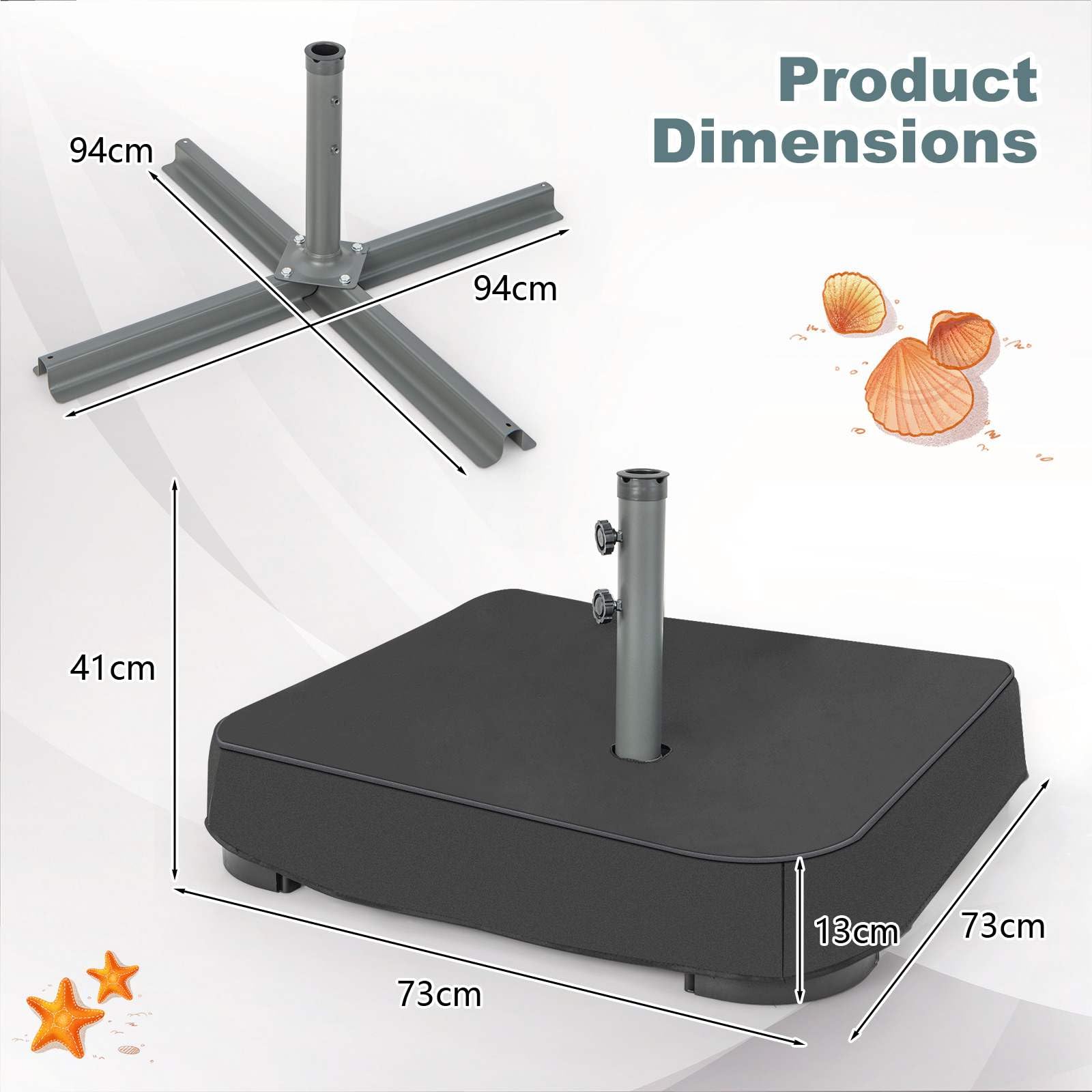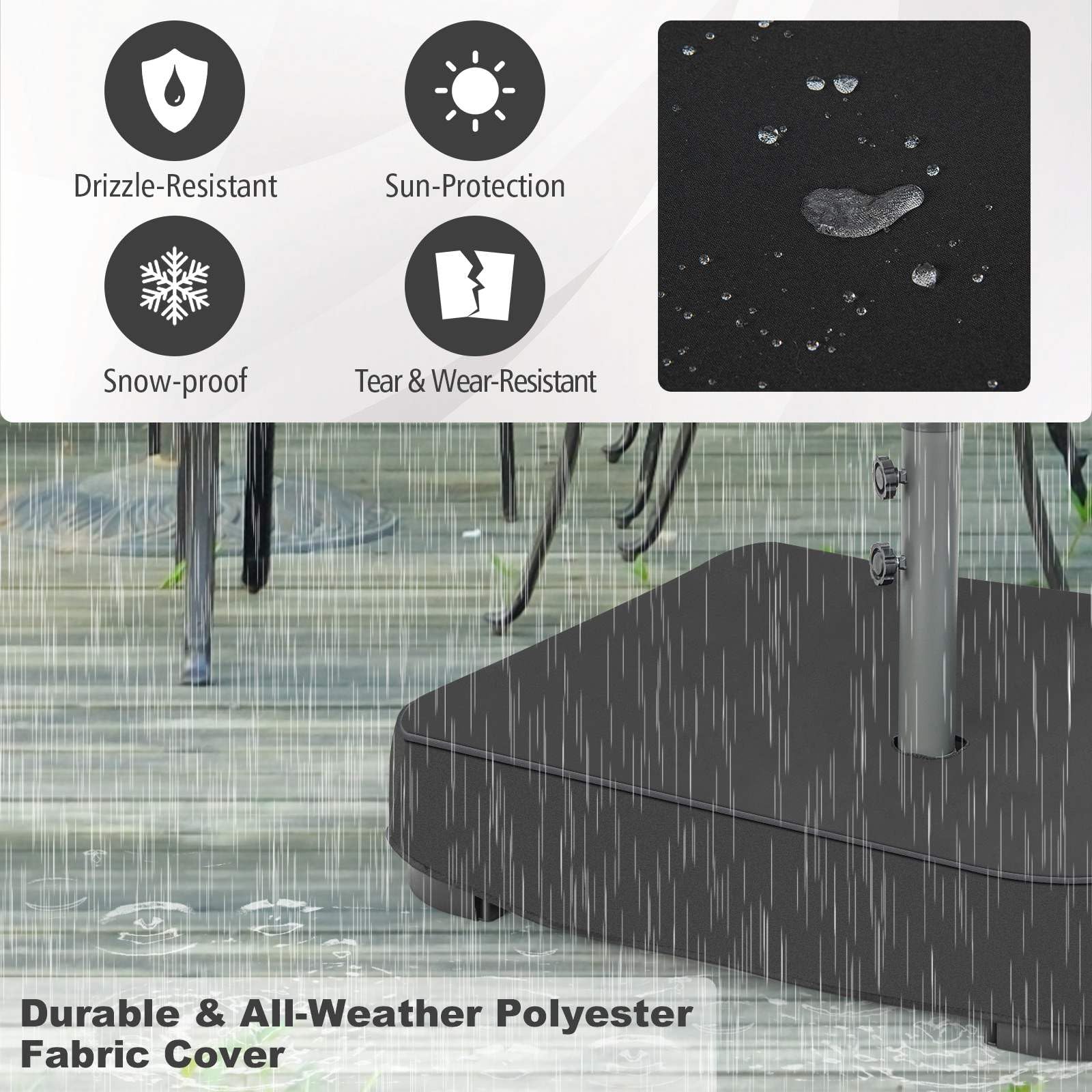 Our 100 kg double-sided patio umbrella base is compatible with multiple types of umbrellas and spaces, and you can use it for outdoor dining at the patio table, by the pool, on the patio, or anywhere you want to enjoy outdoor leisure time. It comes with an adapter to fit different umbrellas with a diameter of 48 mm, and you can use the 2 adjustable tightening knobs to secure the umbrella pole, preventing it from wobbling or falling. More than that, it is easy to set up, just install the frame and then fill sandbags with sand for fixation. 2 sandbags can hold up to 90 kg of sand, allowing the umbrella base to remain upright and stable under windy conditions. In addition, the cover is crafted with all-weather polyester fabric and the frame is constructed of heavy-duty powder-coated metal, ensuring good sturdiness and long-lasting durability.