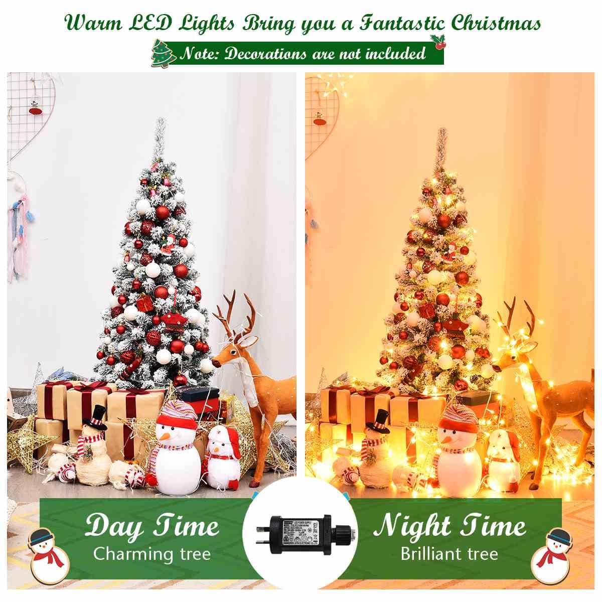 This 1.4/1.8/2.27m snow flocked pre-lit Christmas tree has 242/500/641 branch tips, featuring a realistic appearance, and suits any room in your home. All the needles are made of premium PVC material which makes the tree quite real and safe to use. 150/250/350 warm white LED lights can light up your room and bring you a welcome feeling. The reinforced iron base is strong enough to support the whole tree and keeps it stable and balanced. You can fold it when not in use. You can fluff and assemble the tree effortlessly with its hinged construction. For further use, you can take the tree apart into 2/3/3 sections and store it without much space occupied.