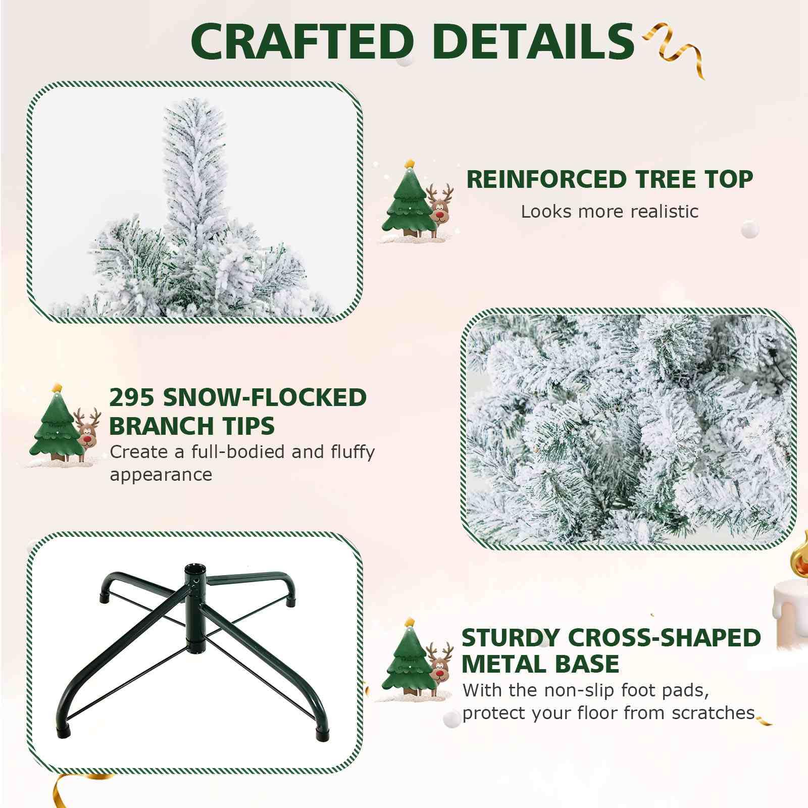 Fluffy and Premium Branch Tips: The 295 branch tips of this flocked artificial tree are made of high quality PVC material, which is not only flame-retardant and odorless, but also very realistic. At the same time, it can bear the weight of some small decorations, providing extra space for you to dress up your Christmas tree.