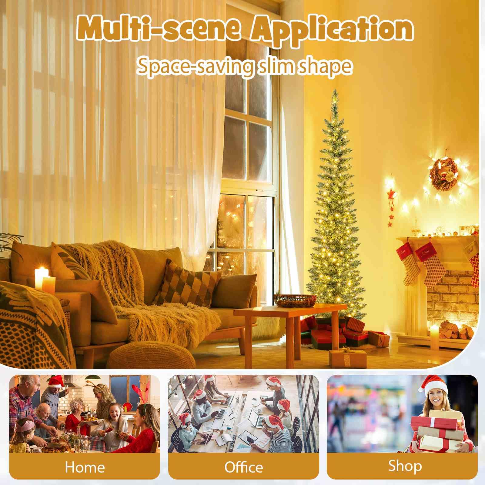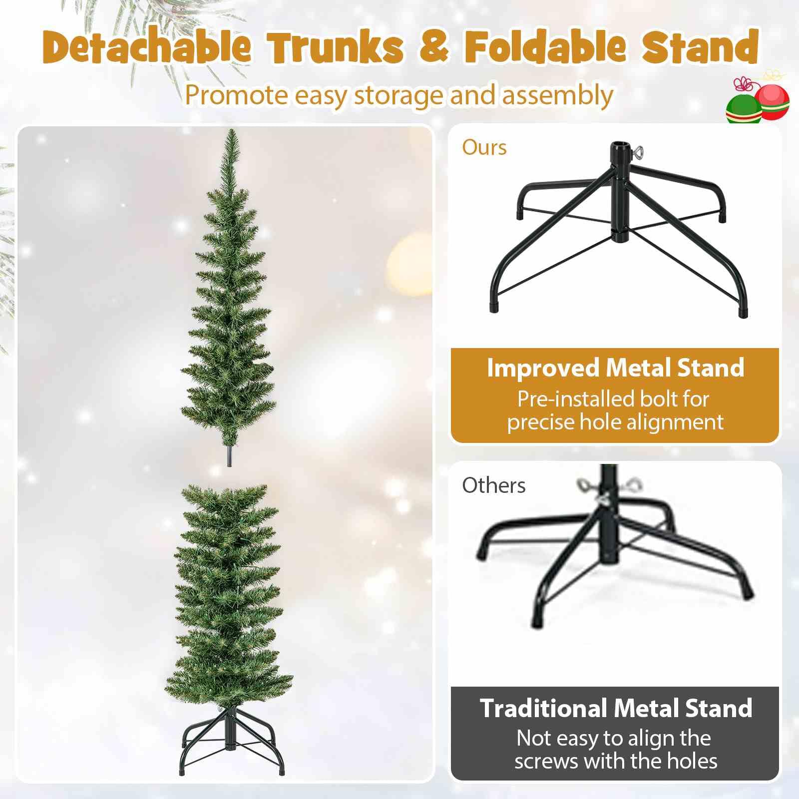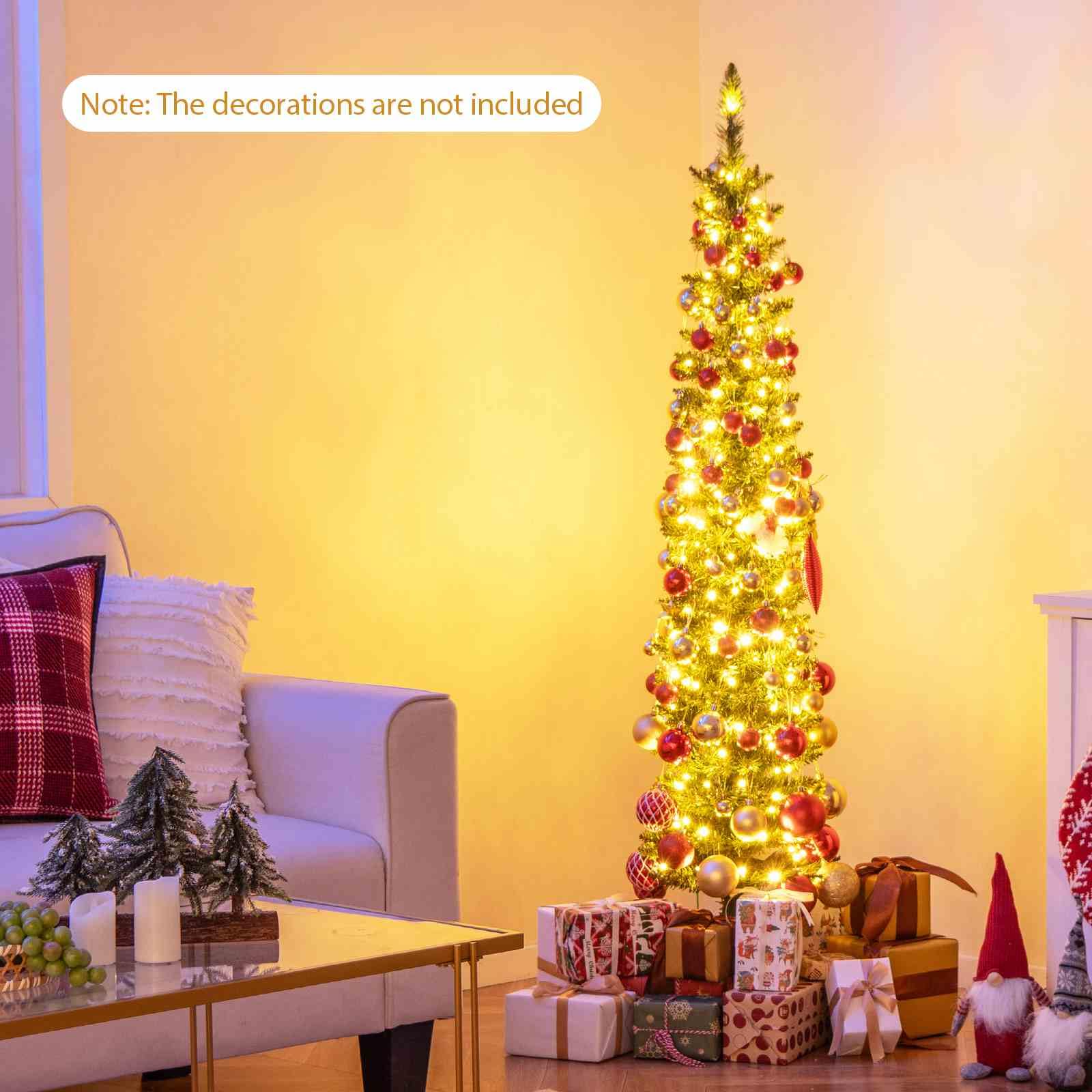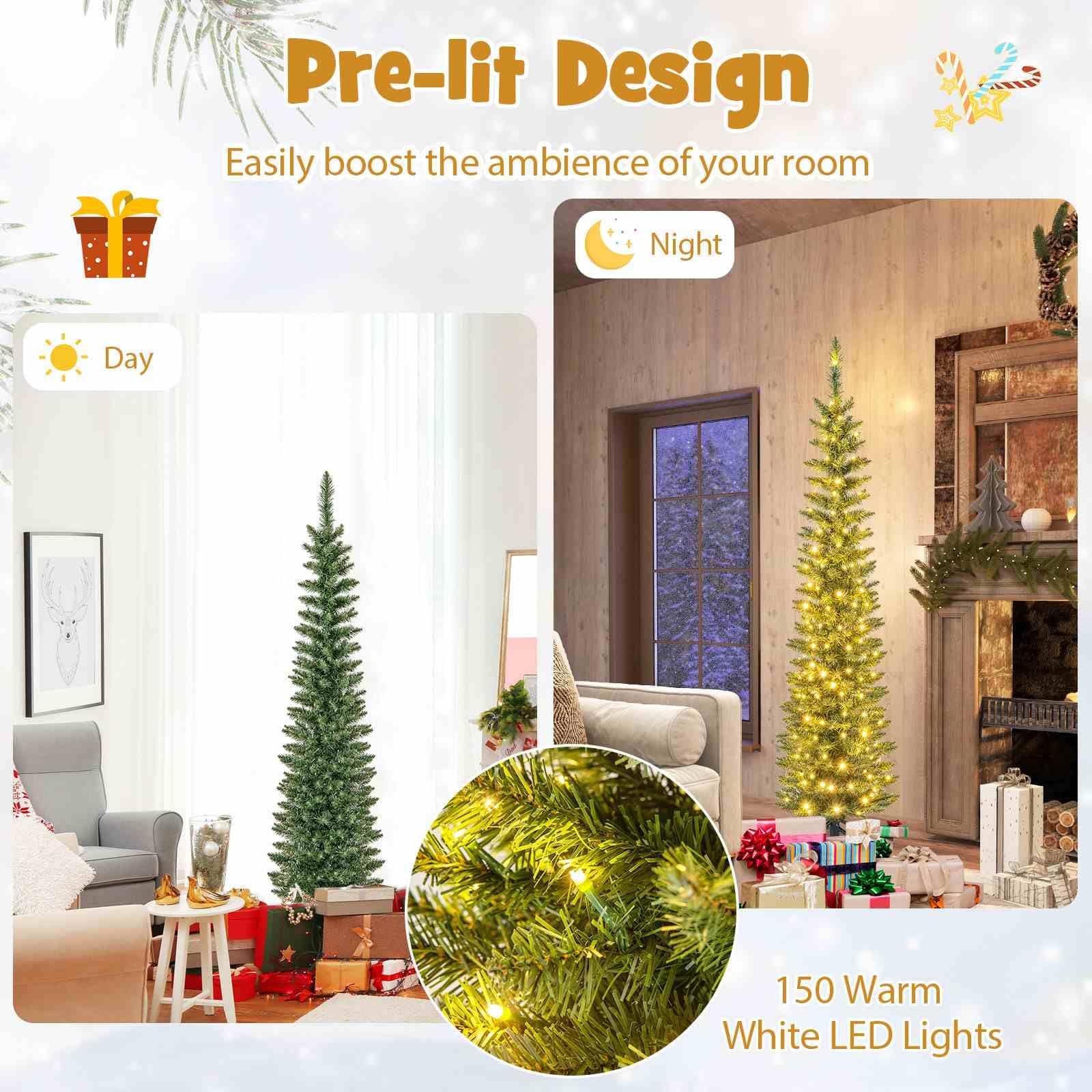 The Christmas tree is designed with 296/390/499/591/699 simulated branch tips to create a lush and realistic appearance. These branch tips are crafted from non-fading PVC material, ensuring a long-lasting and allergy-free display. Safety is a top priority, as the selected material is flame-retardant. To add the festival vibe at day and night, the tree is adorned with 150/180/200/300/400 warm white LED lights. Stability is ensured with a sturdy metal base, reducing the risk of tipping over. Additionally, the base is designed with anti-slip pads to prevent any scratches or damage to your floors. Thanks to pencil shape, the Xmas tree is ideal for small spaces, such as home, office, cafe, store.