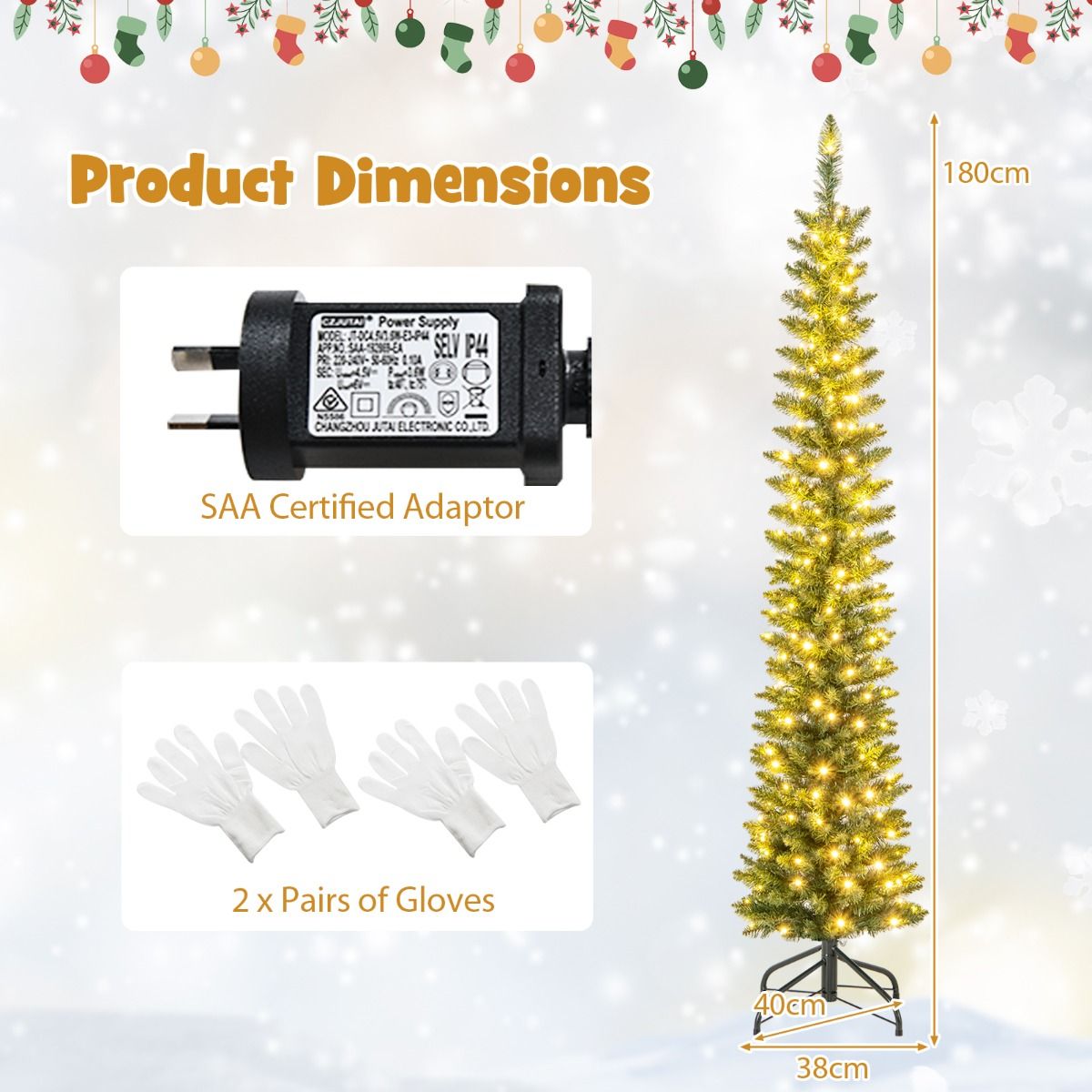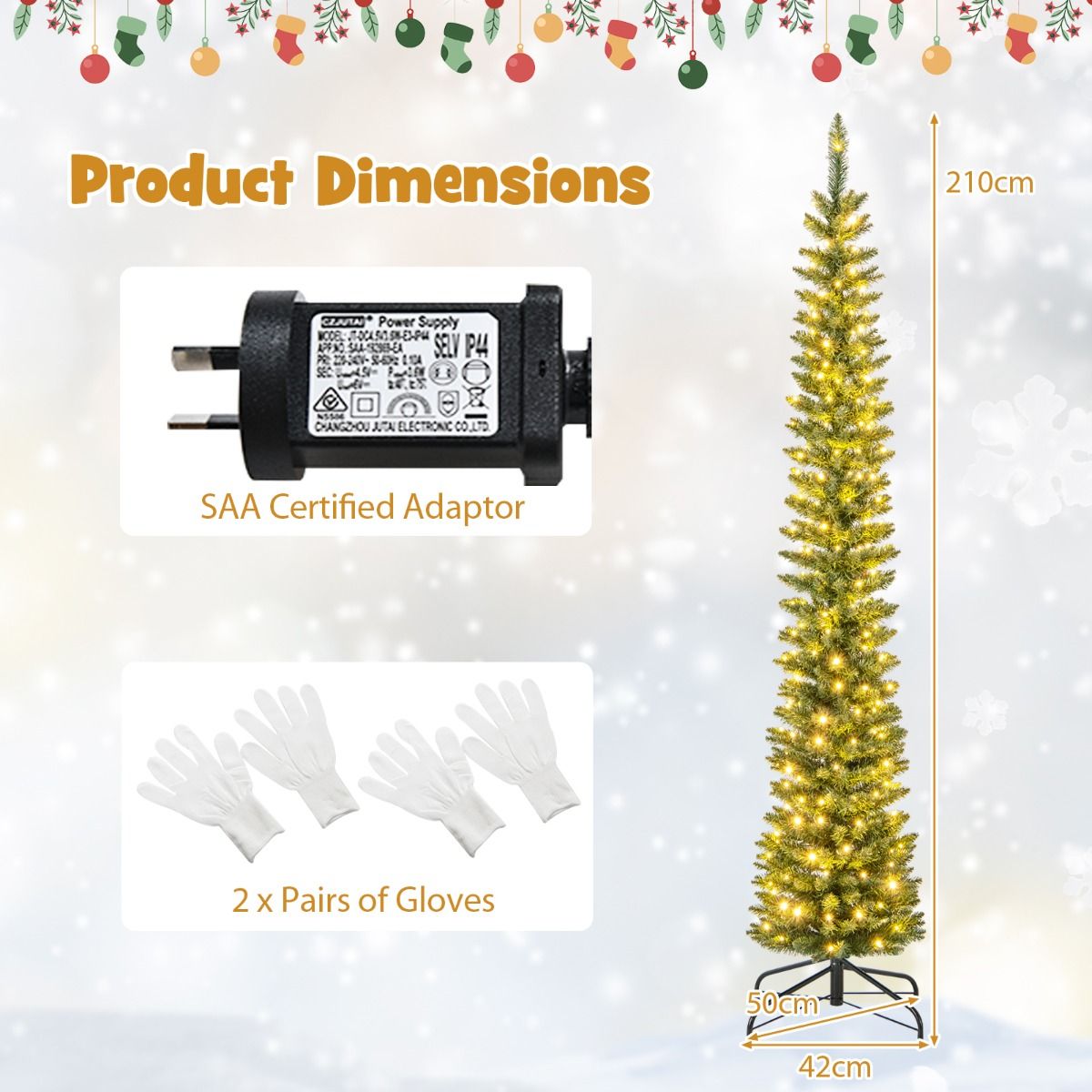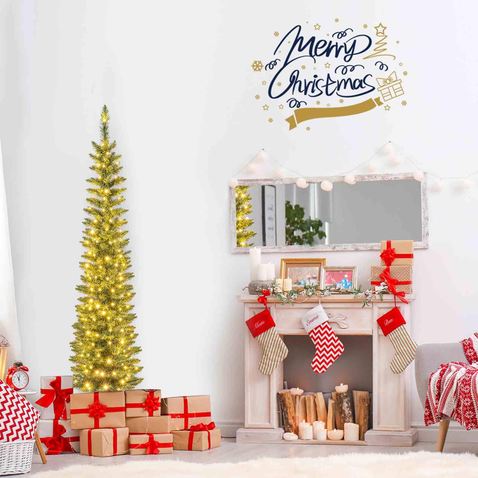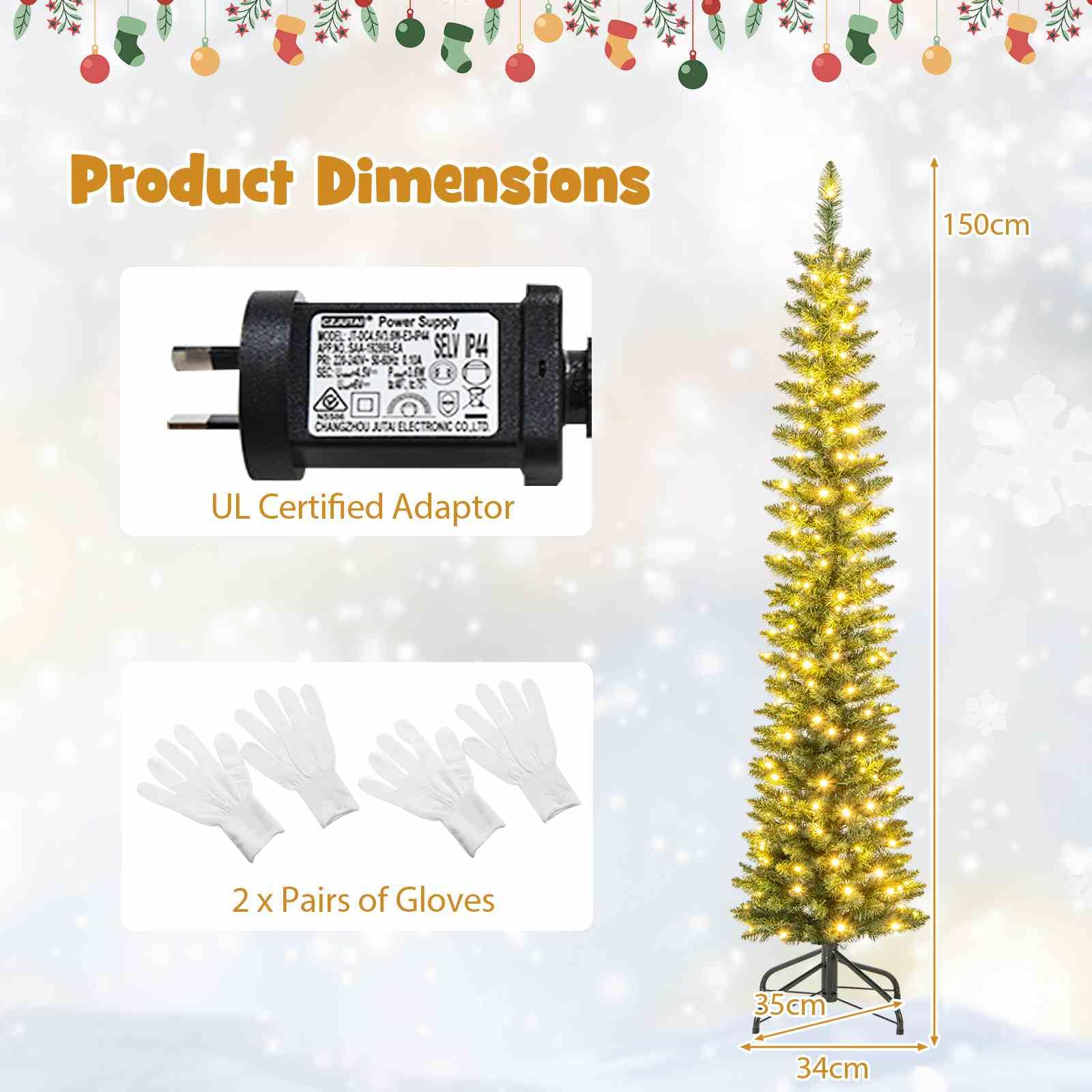 The Christmas tree is designed with 296/390/499/591/699 simulated branch tips to create a lush and realistic appearance. These branch tips are crafted from non-fading PVC material, ensuring a long-lasting and allergy-free display. Safety is a top priority, as the selected material is flame-retardant. To add the festival vibe at day and night, the tree is adorned with 150/180/200/300/400 warm white LED lights. Stability is ensured with a sturdy metal base, reducing the risk of tipping over. Additionally, the base is designed with anti-slip pads to prevent any scratches or damage to your floors. Thanks to pencil shape, the Xmas tree is ideal for small spaces, such as home, office, cafe, store.
