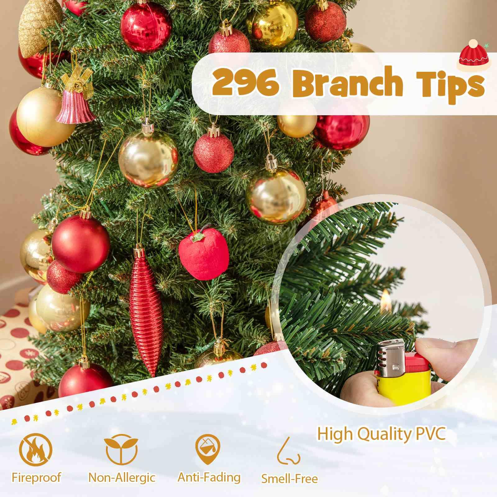 100% Premium New PVC: Each branch tip is made from high-quality non-fading PVC material, ensuring a long-lasting display. Meanwhile, the material is flame-retardant and allergy-free, enabling your family to enjoy the beauty of a lush Xmas tree without any concerns.