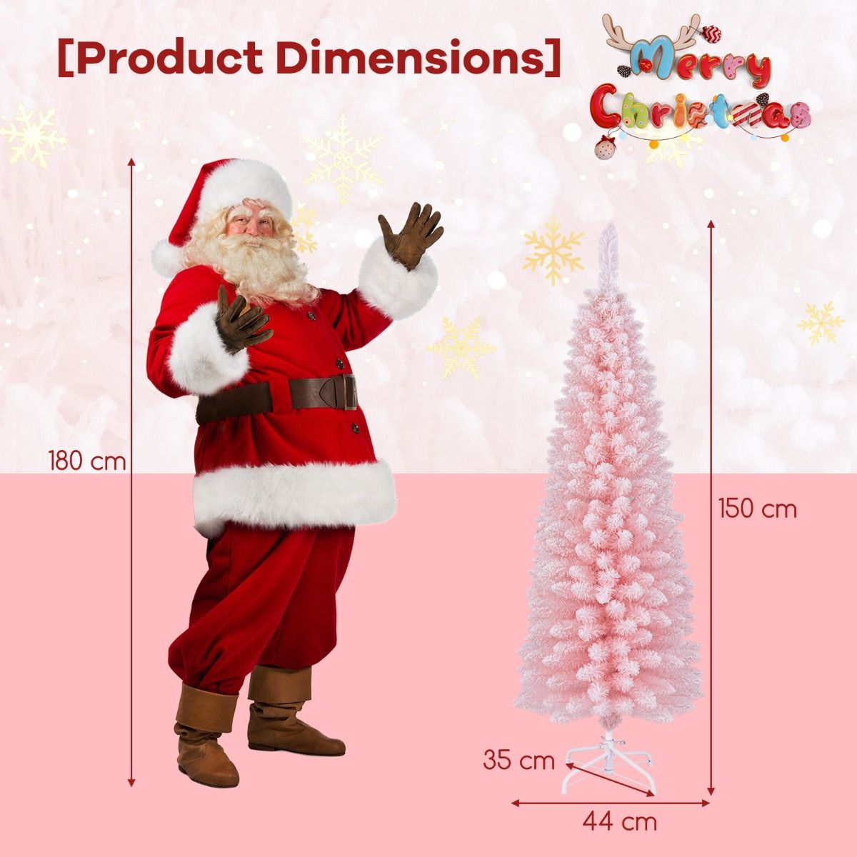 Our 1.5/1.8M artificial Christmas tree is adorned with captivating pink foliage and enveloped in thick flocked snow, which exudes opulence and charm, sure to mesmerize all who behold it. And it comes with 328/460 dense branch tips for a natural and full-bodied appearance. Besides, the leaves are crafted of flame-retardant and odorless PVC material, ensuring both safety and longevity for your festive celebrations. The stable crossed metal base provides exceptional support, ensuring a sturdy and secure placement for your tree. Moreover, its slender pencil tree shape makes the tree an ideal choice for smaller areas, fitting perfectly in tight corners or limited spaces. Whether embellishing it with classic ornaments for a traditional look or getting creative with themed decoration for various celebrations, the exquisite pink Xmas tree offers endless opportunities to showcase your unique style throughout the year.