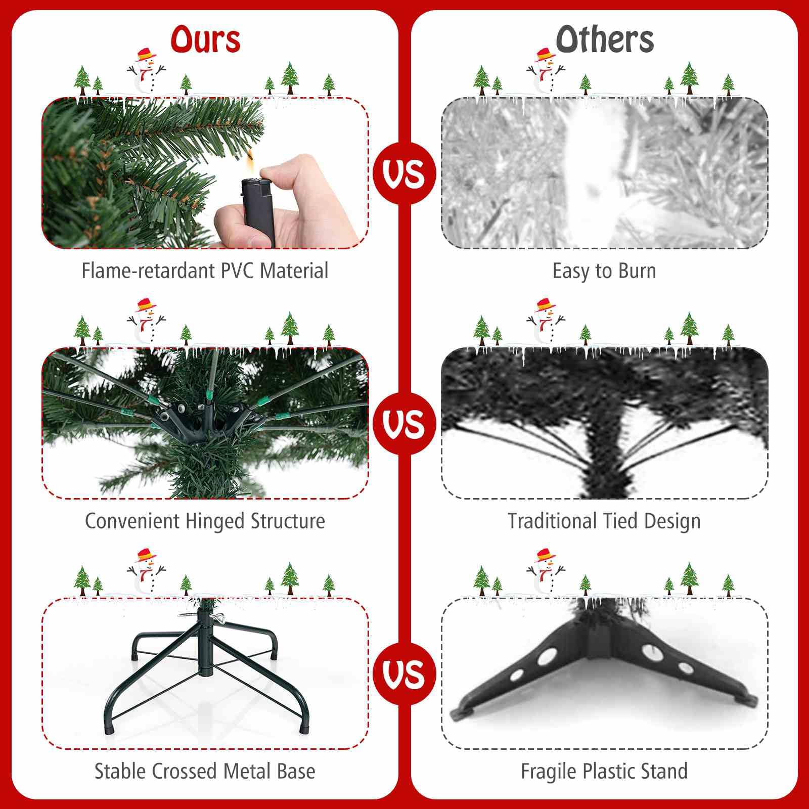 100% New PVC: Thanks to selected PVC, the Xmas tree becomes fireproof, smell-free, non-allergic, and resistant to fading, offering a safe and enduring festive centerpiece that retains its vibrant charm season after season.