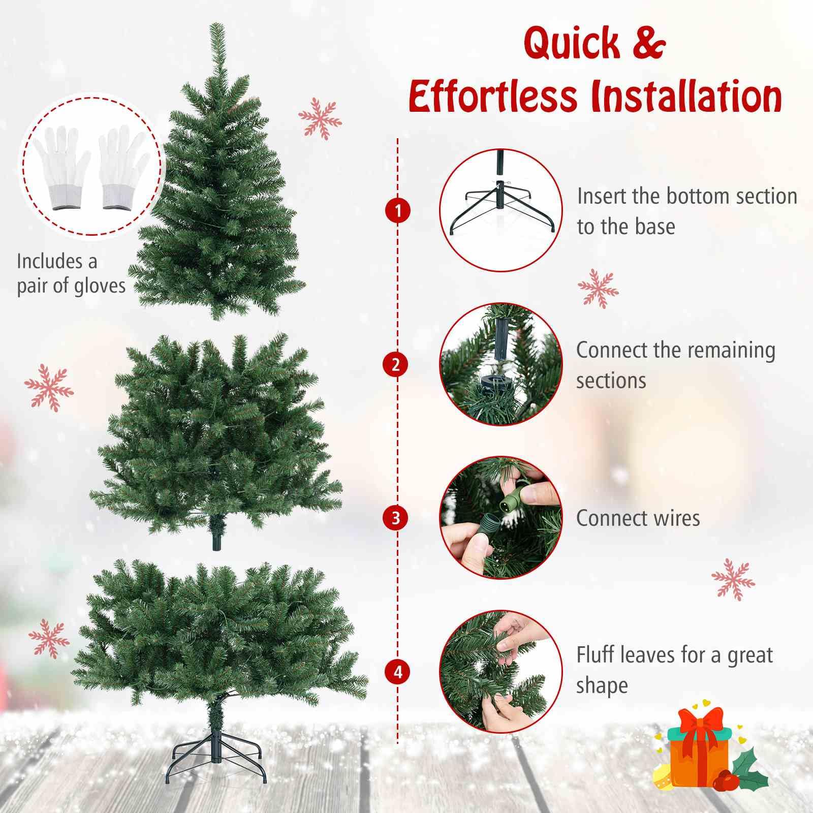 Effortless Setup: Simplify your holiday decorating with the 3-section Xmas tree, featuring a hinged structure and a sturdy folding metal stand. It is complete with a pair of gloves for a hassle-free setup that’s ready to shine in no time.