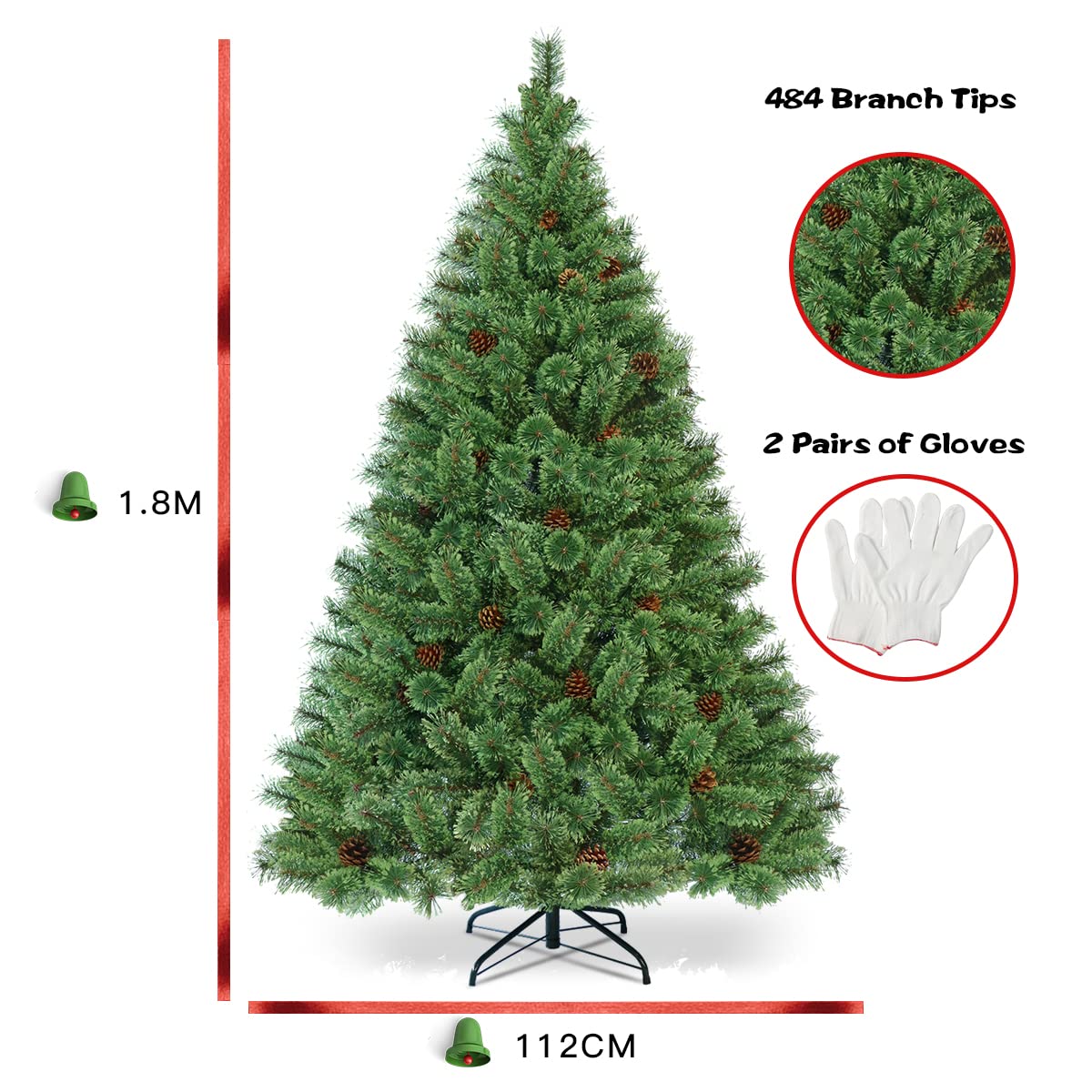 Spread the joy this holiday season with our 180 cm Pre-Lit Pine Artificial Christmas Tree. This artificial tree has 484 branch tips, is decorated with pine cones and 260 lights, which looks pretty full and lifelike. So many lights elegantly illuminate the living room, creating a strong festive atmosphere. And the four-legged bracket is made of high-quality thick metal, which improves the stability of the tree. In regards to putting the tree together and connecting the lights, it is very easy and self-explanatory. Just connect the base to the largest part of the tree, then connect the rest and fluff out the branches easily. And to avoid hurting your hands during installation, we also provide two pairs of gloves so you can enjoy the hands-on fun with your family! After the festival, simply disassemble the tree into three hinged parts for storage in a box. Start your cheer a little earlier and just decorate the Christmas tree for each of the upcoming holidays.