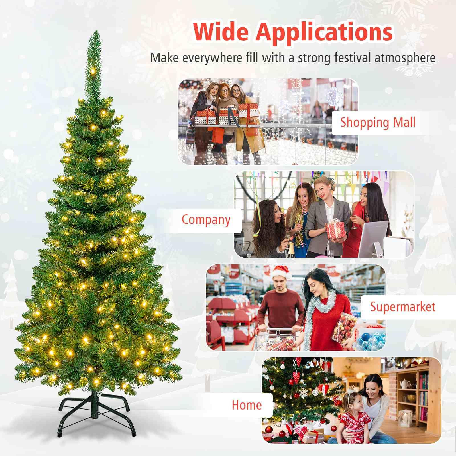 The artificial pencil tree has 226/708/1085 branch tips and 150/250/350 warm white LED lights. In the daytime, it's an evergreen tree. At night, it becomes a lighted decoration tree to attract attention. What's more, its branches are made of new PVC which is non-fading, non-allergic and fireproof. With a detailed manual, it's easy for you to assemble 2/3/3 sections, while hinged system simplifies the entire setup. By the way, the 135/198/230cm holiday decoration tree is supported by a folding metal stand, so the overall stability is well ensured.