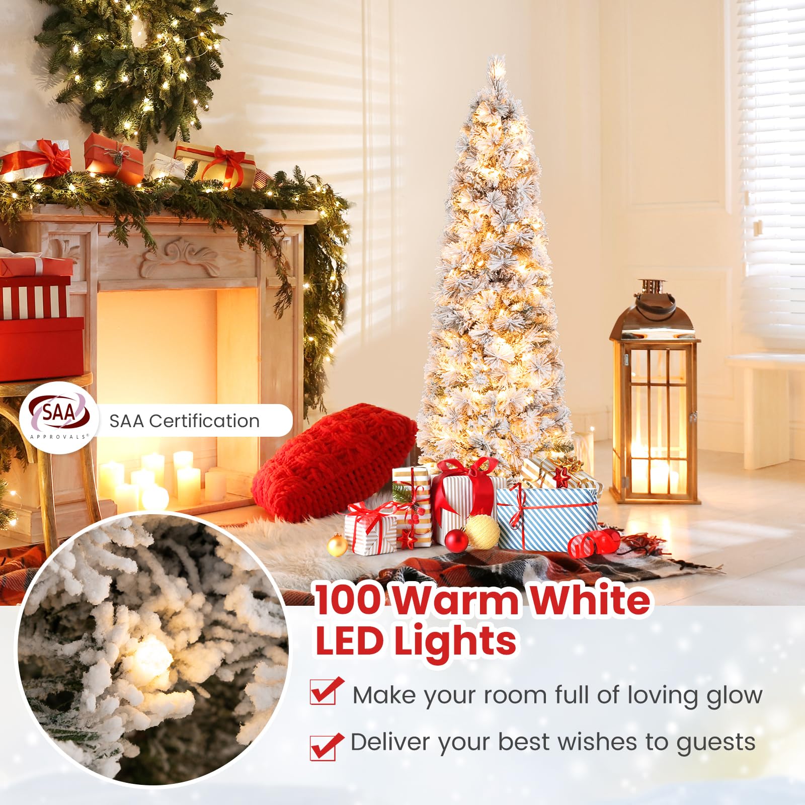 Its slim design, adorned with 258/373/466 flourishing branch tips, infuses your space with the vivacity of real trees while maintaining ample floor space. Revel in the tender glow emitted by up to 100/150/210 warm white LED lights, which will make your room full of loving glow. The Xmas tree seamlessly blends fan-shaped pine needles and lifelike PVC leaves, artfully replicating the natural charm of real trees. Crafted from 100% new PVC, it seamlessly withstands fire, fading and allergies, ensuring longevity. Transport yourself to a snow-covered wonderland with the delicately flocked appearance. The tree effortlessly assembles and disassembles with 3 sections, complemented by a stable folding metal stand that safeguards your floors. For your protection, a pair of gloves is thoughtfully included.