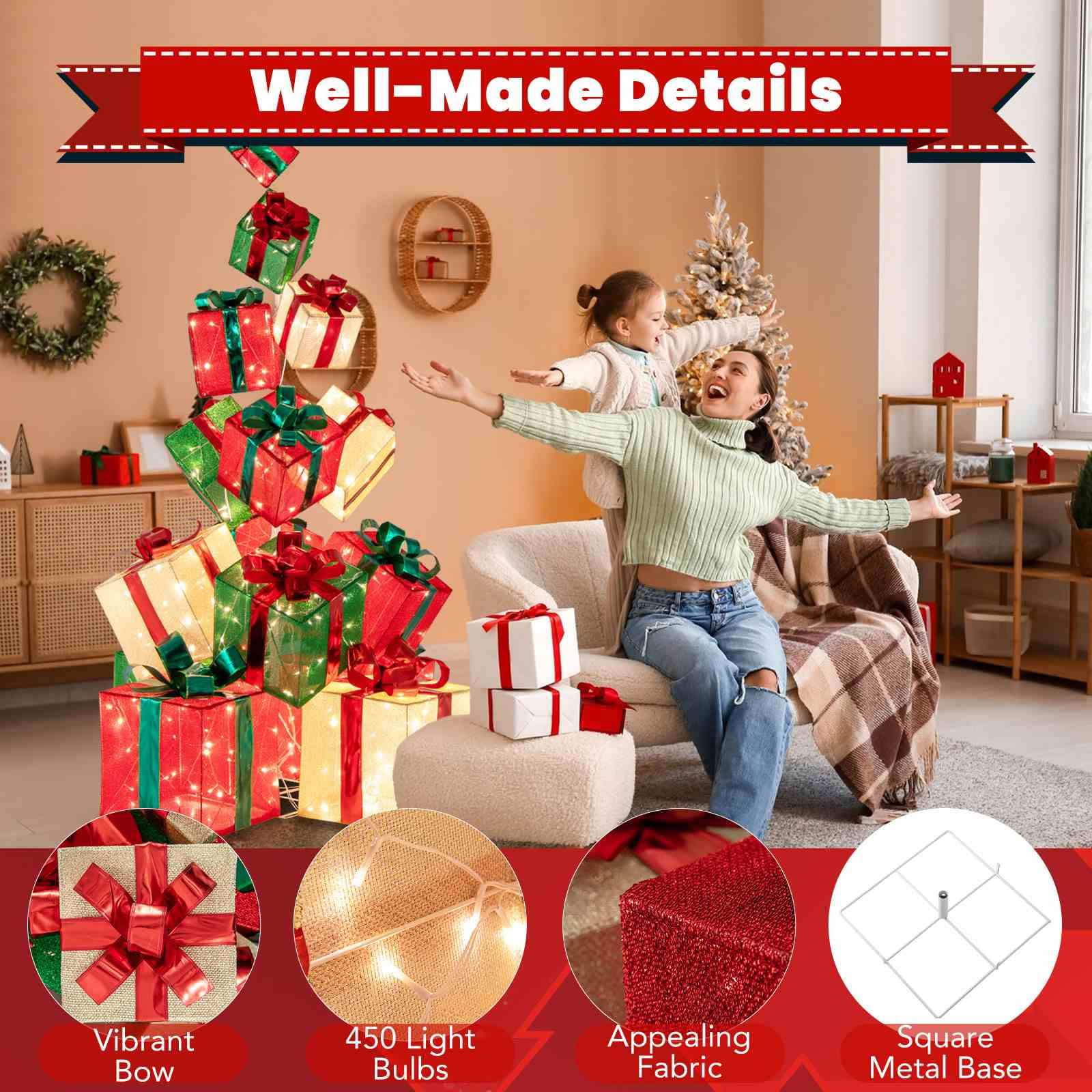 Multipurpose Festive Boxes: Comprising 15 varied-sized boxes, this Xmas decoration set offers versatility in holiday decorating. You can arrange them individually or stack them into an impressive 170 cm tower with included metal pole, turning any room into a festive focal point.