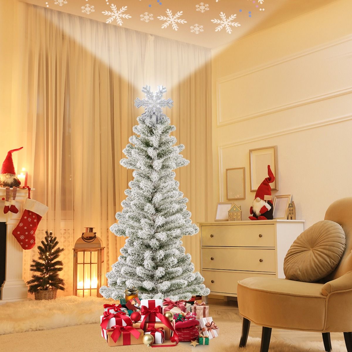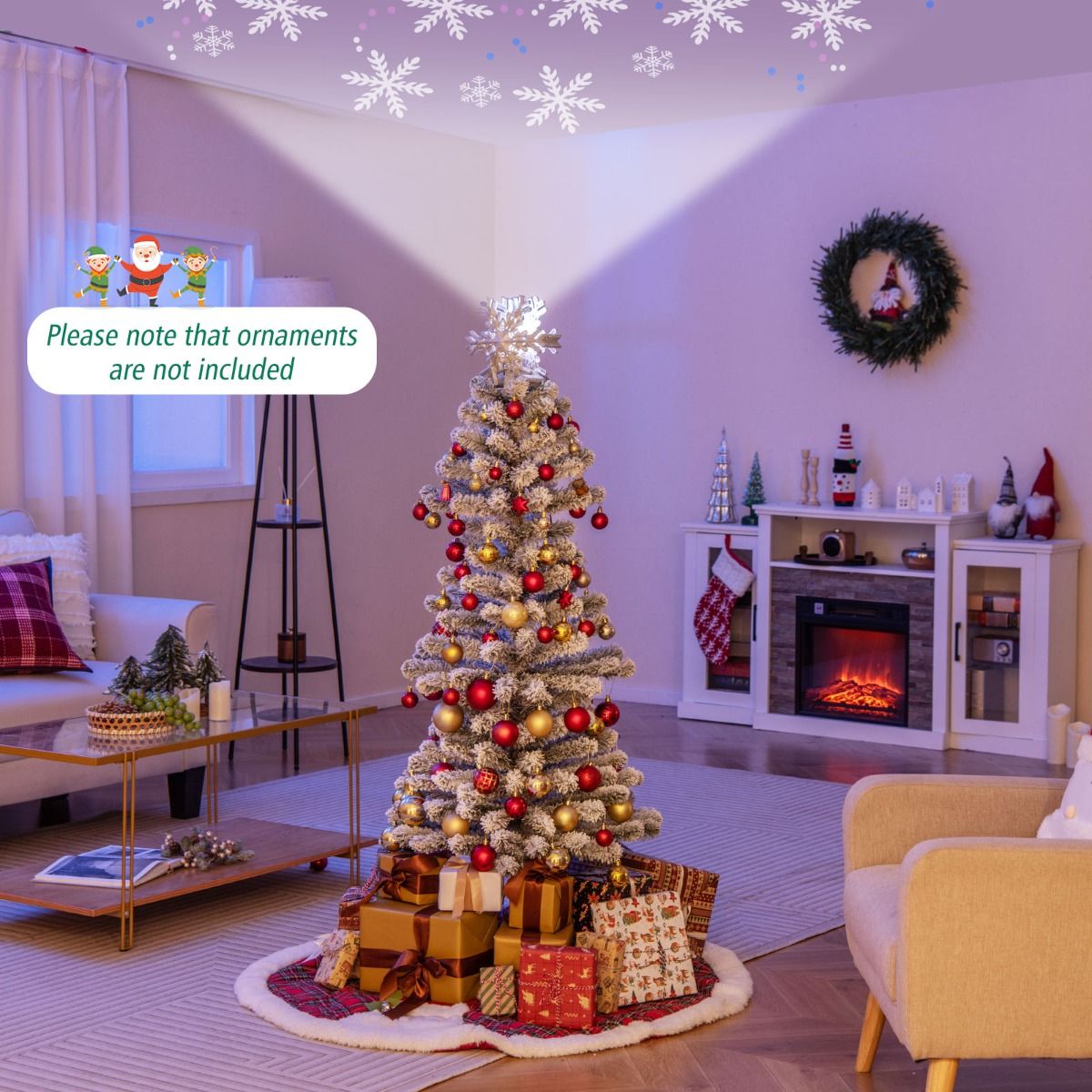 Enchanting Lighted Topper: Captivate your guests with the Xmas tree’s snowflake lighted topper, which boasts a glittering surface for an extra sparkle. The innovative rotary snowflake projection will illuminate your ceilings with dancing snowflakes.