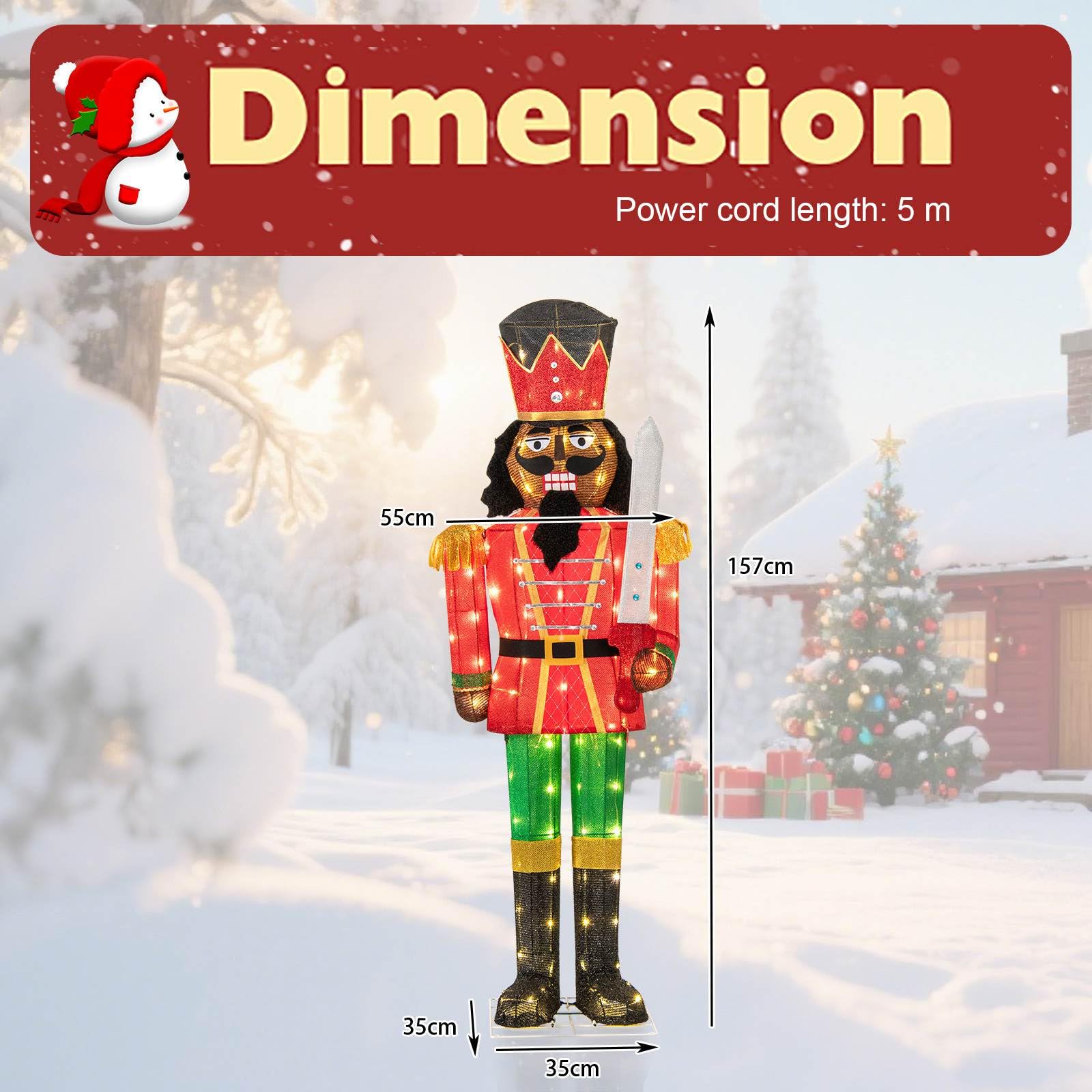 Lighted Nutcracker Soldier: This nutcracker soldier stands 157 cm tall with a regal hat, well-crafted facial features, an exquisite costume, and a glittering sword holding in hand, bringing a classic Christmas charm to any space.