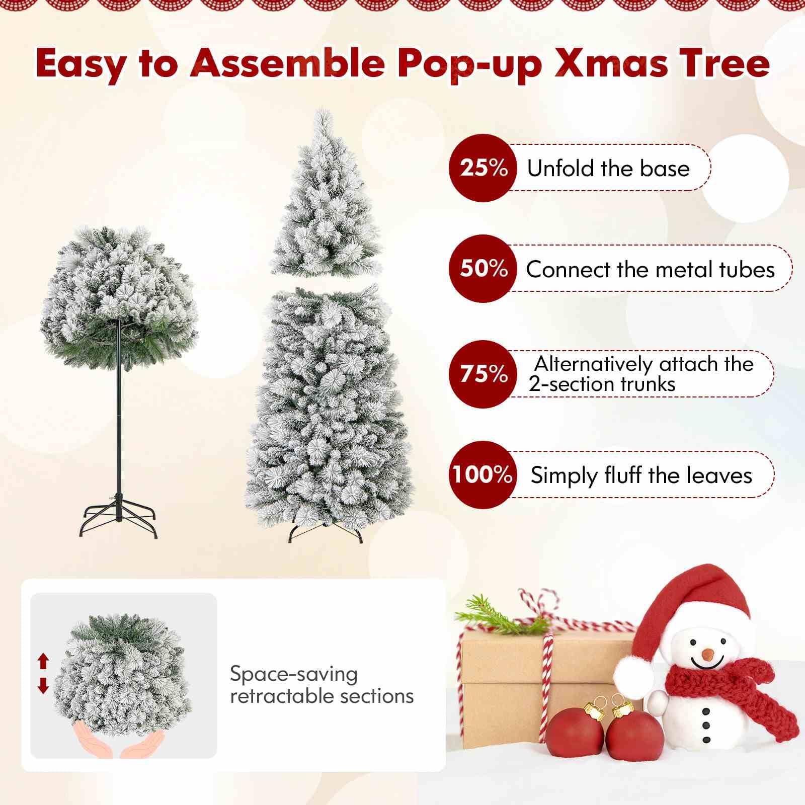 Effortless Assembly: Experience the convenience of the Xmas tree with its innovative pop-up design. Featuring just 2 sections, including one collapsible section, setting up your holiday centerpiece has never been quicker or easier.