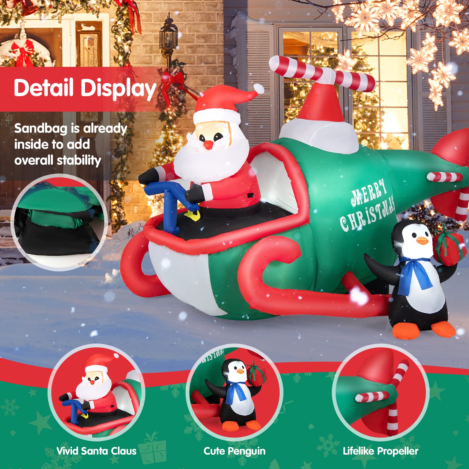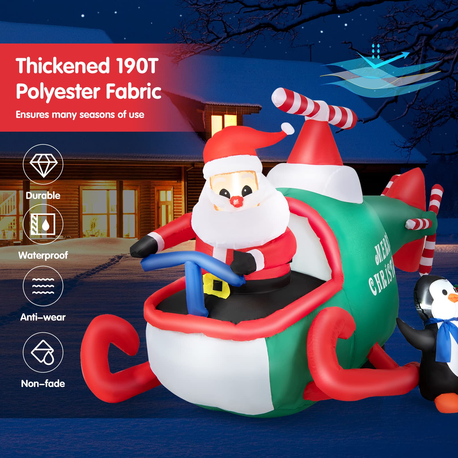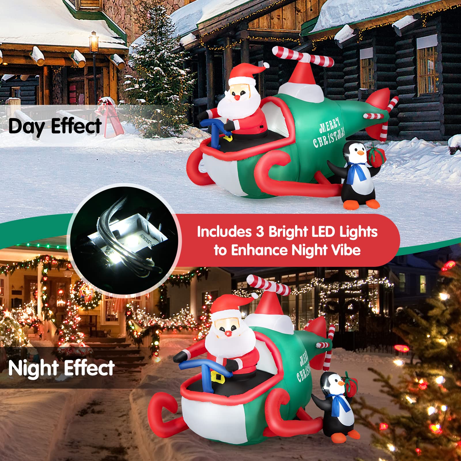 Attractive Christmas Decoration: Santa Claus smiles benignly, driving the helicopter with a little cute penguin. Now they are coming to your town! The special appearance makes the inflatable decoration the highlight of your backyard, which will surely be loved by little kids!