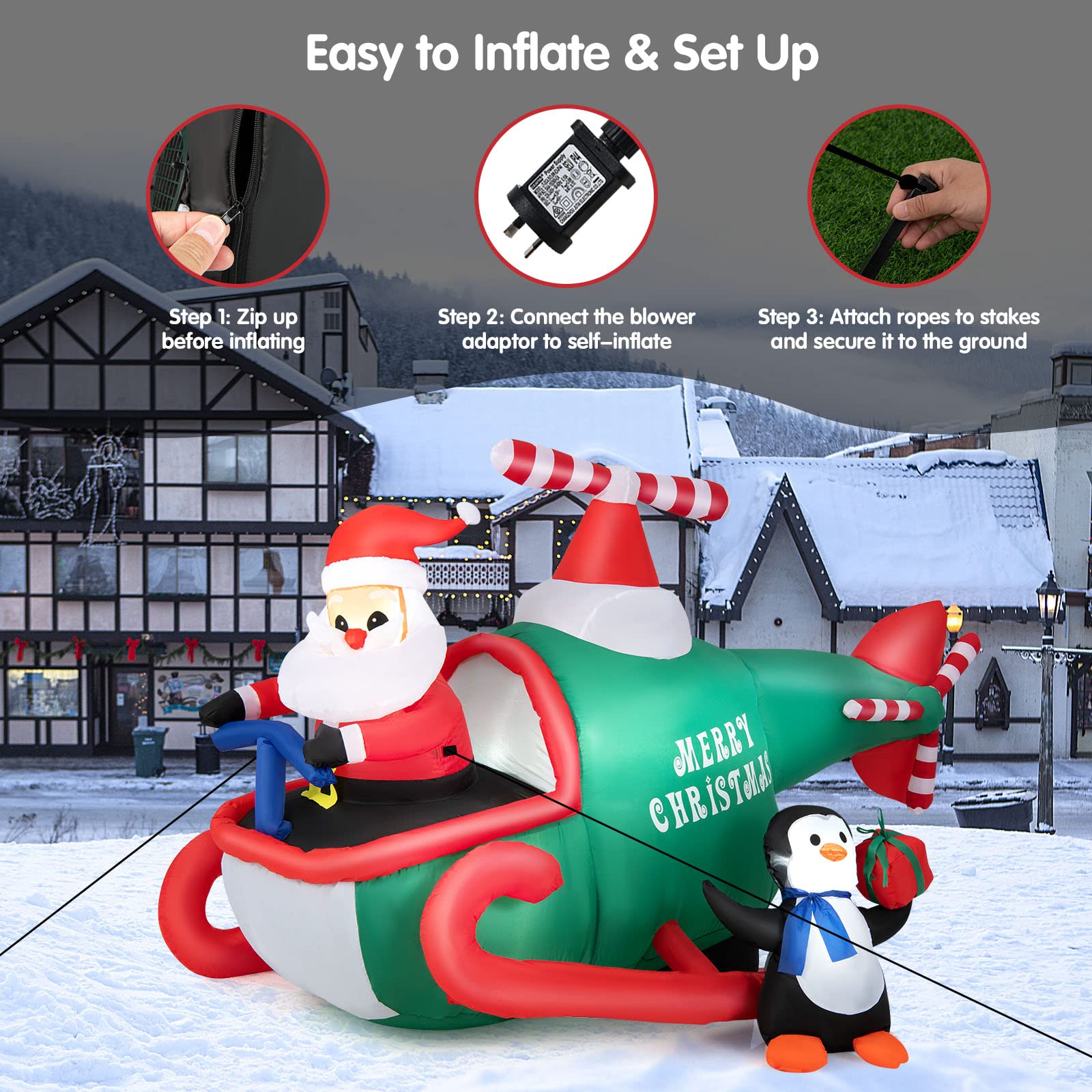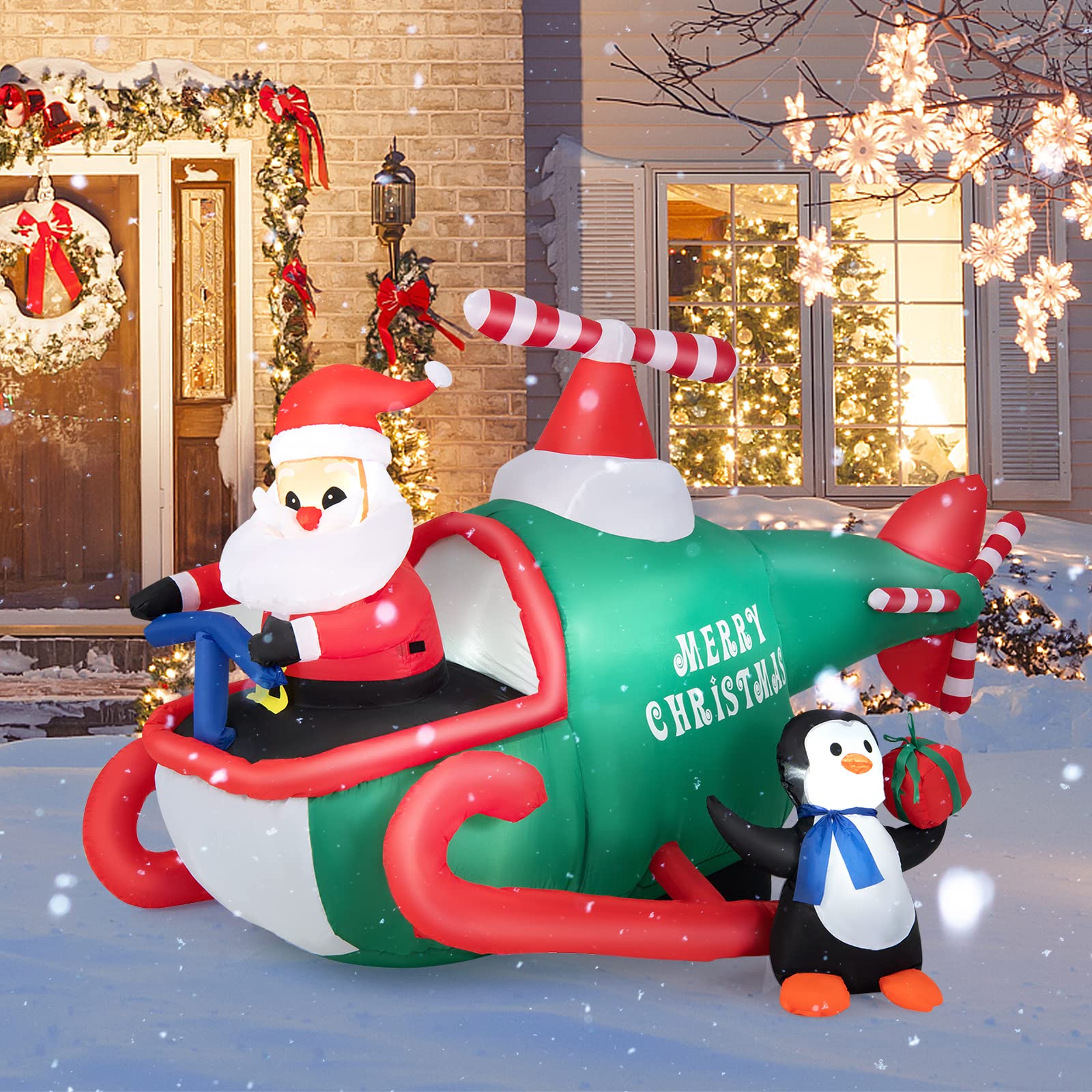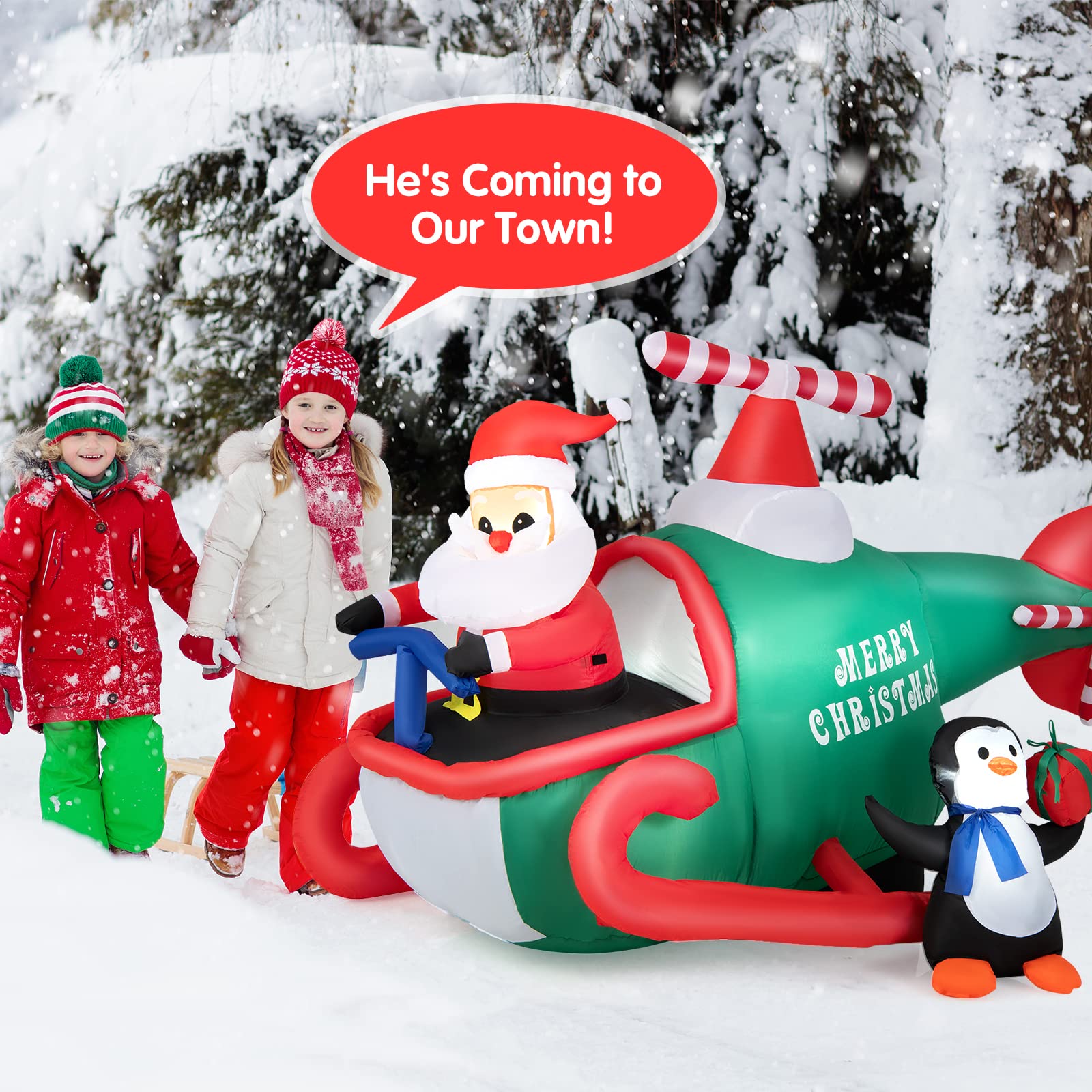 Attractive Christmas Decoration: Santa Claus smiles benignly, driving the helicopter with a little cute penguin. Now they are coming to your town! The special appearance makes the inflatable decoration the highlight of your backyard, which will surely be loved by little kids!