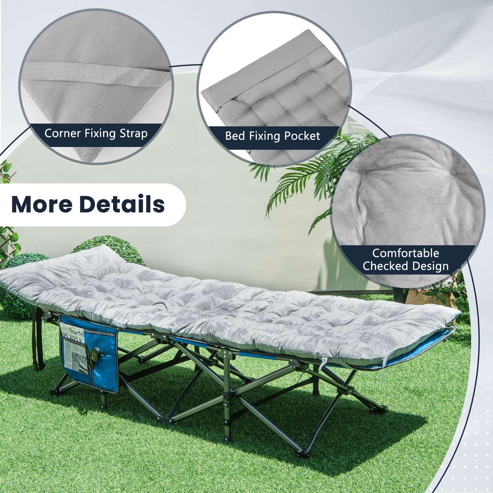 Enhance your outdoor seating experience with our outdoor lounge chair cushion. Made with premium crystal velvet material and filled with high-quality PP cotton, this cushion provides exceptional comfort and durability. In addition, its suitable size makes it perfect for camping, patio lounging, park picnics, or indoor relaxation. The breathable construction ensures proper air circulation, while the corner fixing straps and bed fixing pocket keep the cushion securely in place. Please note that this product does not include a cot.