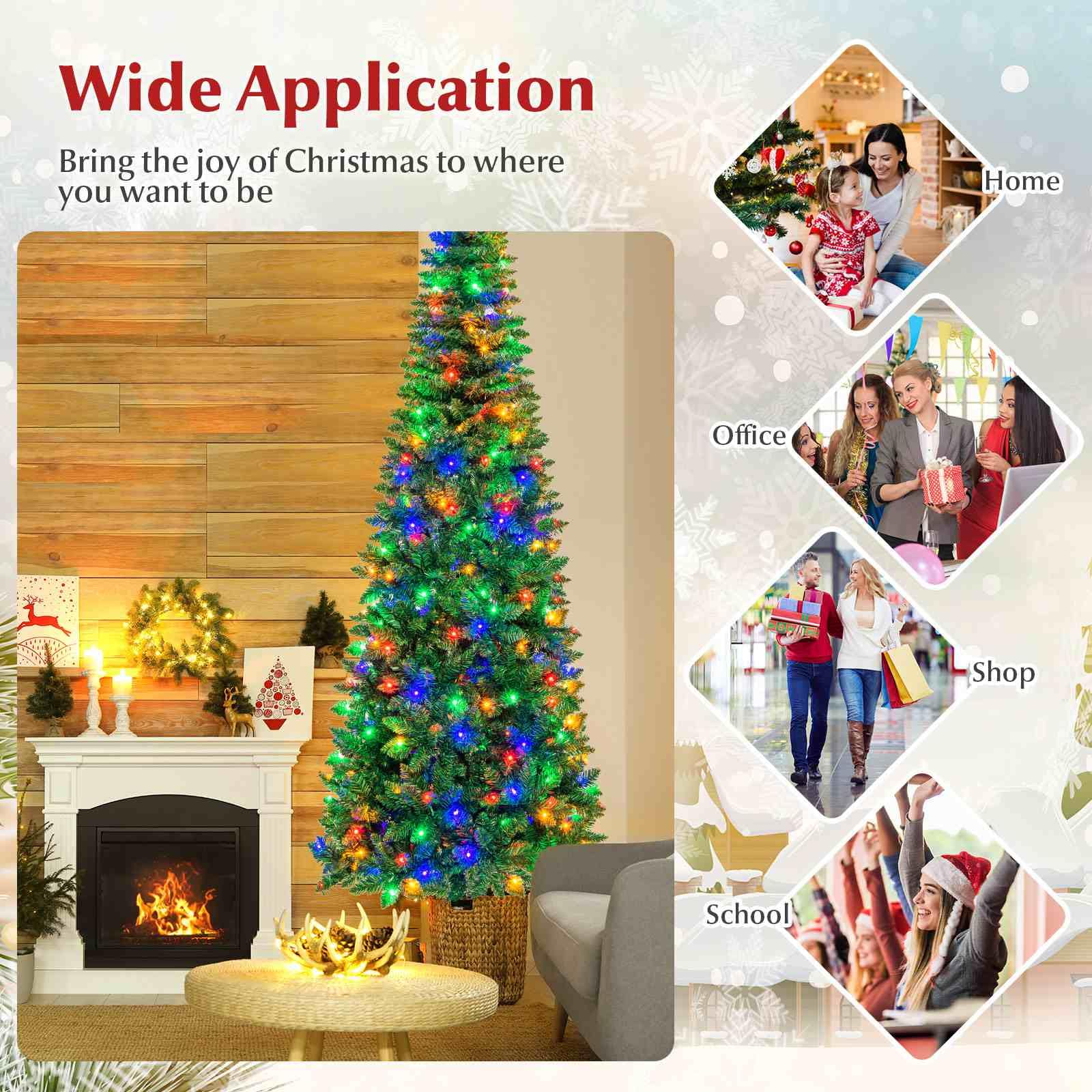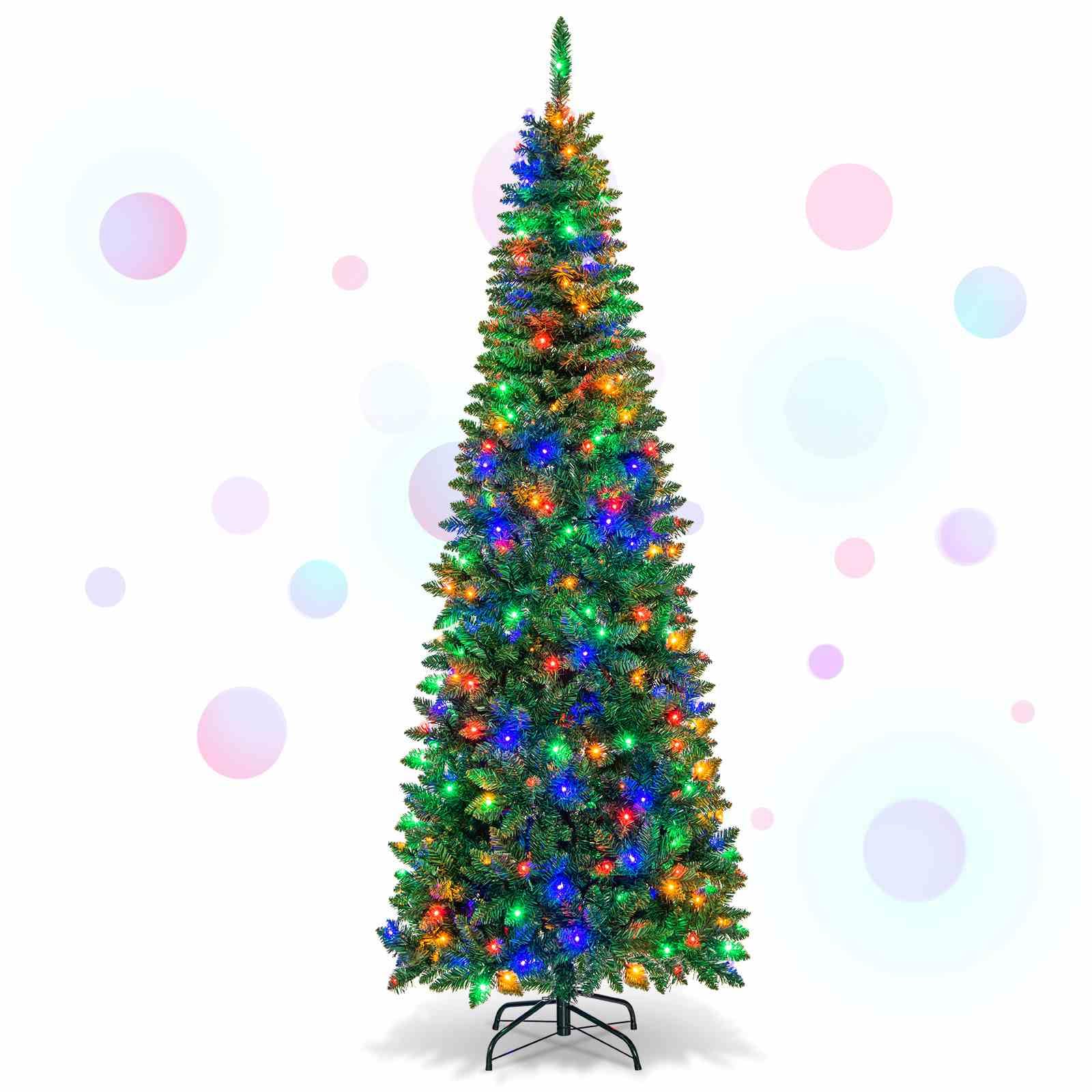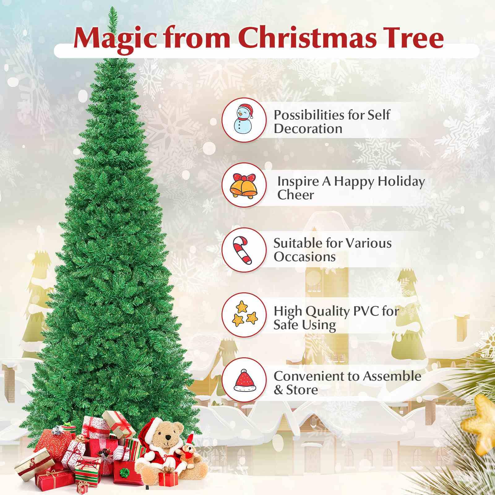 This is our brand new 2.29 M pre-lit pencil Christmas tree which is designed with 1085 branch tips to offer a realistic and lush appearance. Pre-installed with 350 colorful LED lights, the slim tree saves you the hassle of hanging up the lights and help light up your room. It is effortless to make the tree fluff due to its hinged construction, while also facilitating its assemble and storage. Foldable X-shaped iron stand with foot pads prevents breakage and enhances the balance of the tree, offering stability to keep the wondrous tree standing all year around. The most important thing is that it also comes with a desktop Christmas tree. Whether for your home, courtyard, or for commercial places like shops, hotels, the slim Christmas pencil tree is the perfect eye-catching decoration to add multiple fun and festive holiday fullness!