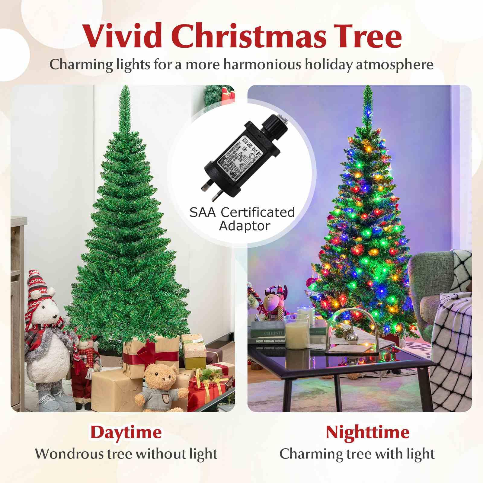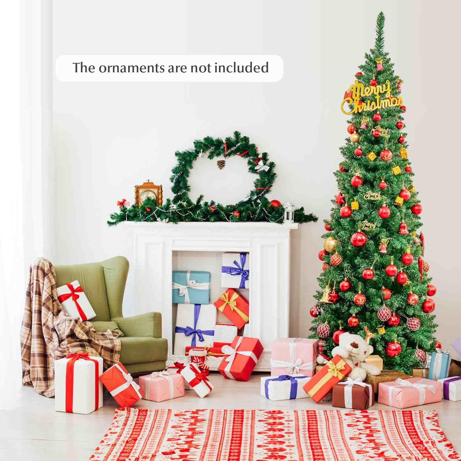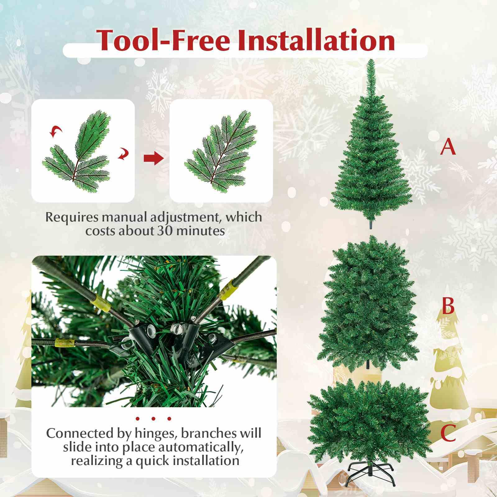 This is our brand new 2.29 M pre-lit pencil Christmas tree which is designed with 1085 branch tips to offer a realistic and lush appearance. Pre-installed with 350 colorful LED lights, the slim tree saves you the hassle of hanging up the lights and help light up your room. It is effortless to make the tree fluff due to its hinged construction, while also facilitating its assemble and storage. Foldable X-shaped iron stand with foot pads prevents breakage and enhances the balance of the tree, offering stability to keep the wondrous tree standing all year around. The most important thing is that it also comes with a desktop Christmas tree. Whether for your home, courtyard, or for commercial places like shops, hotels, the slim Christmas pencil tree is the perfect eye-catching decoration to add multiple fun and festive holiday fullness!