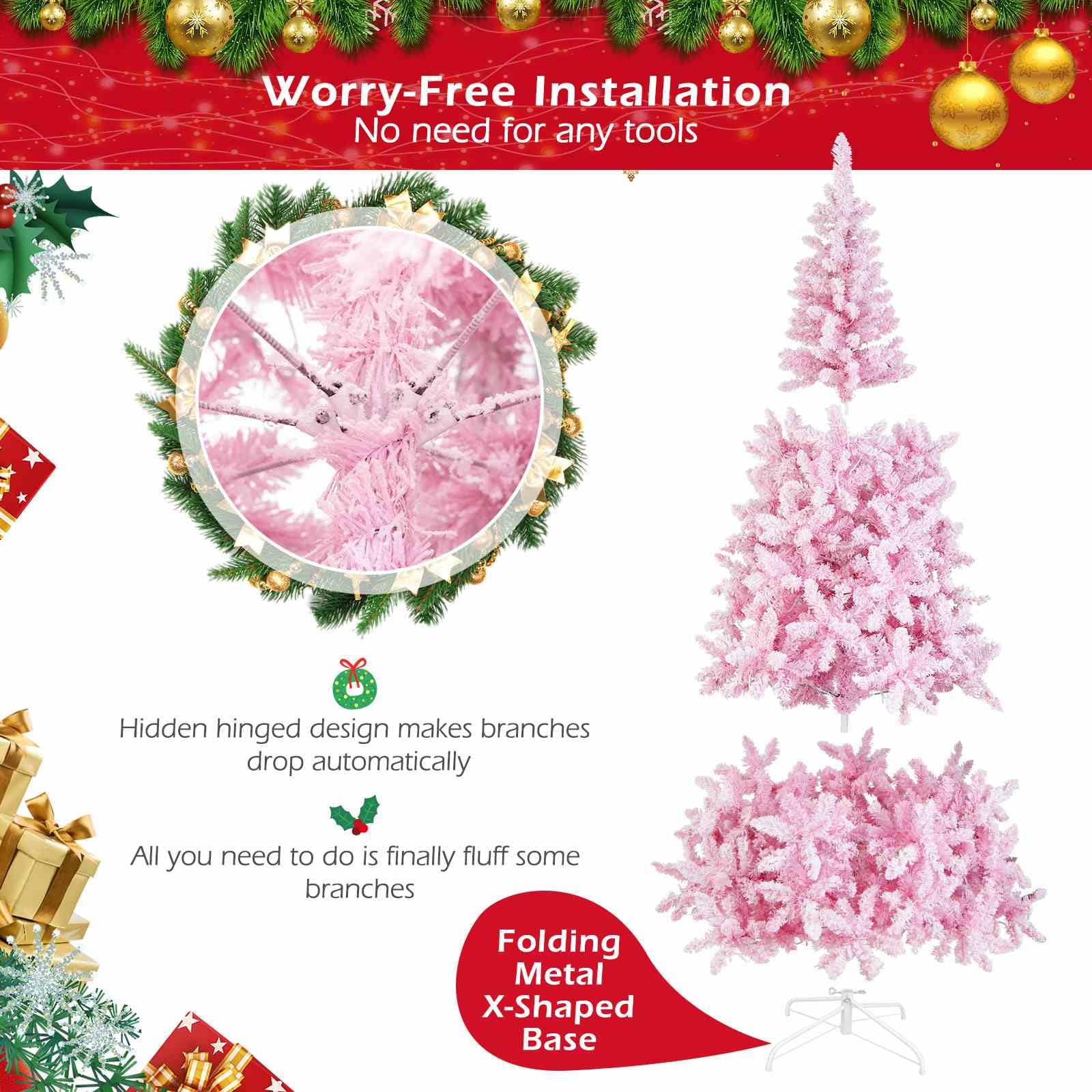 Gorgeous Snow Flocked Pink Look: A little color change can bring you a new experience, which is why this Christmas tree comes in pink. The realistic snow flocked leaves feature a strikingly beautiful appearance that is suitable for winter holiday. With its prominent shape and color, this Christmas tree will be a perfect decor in home, office, shopping center, etc.