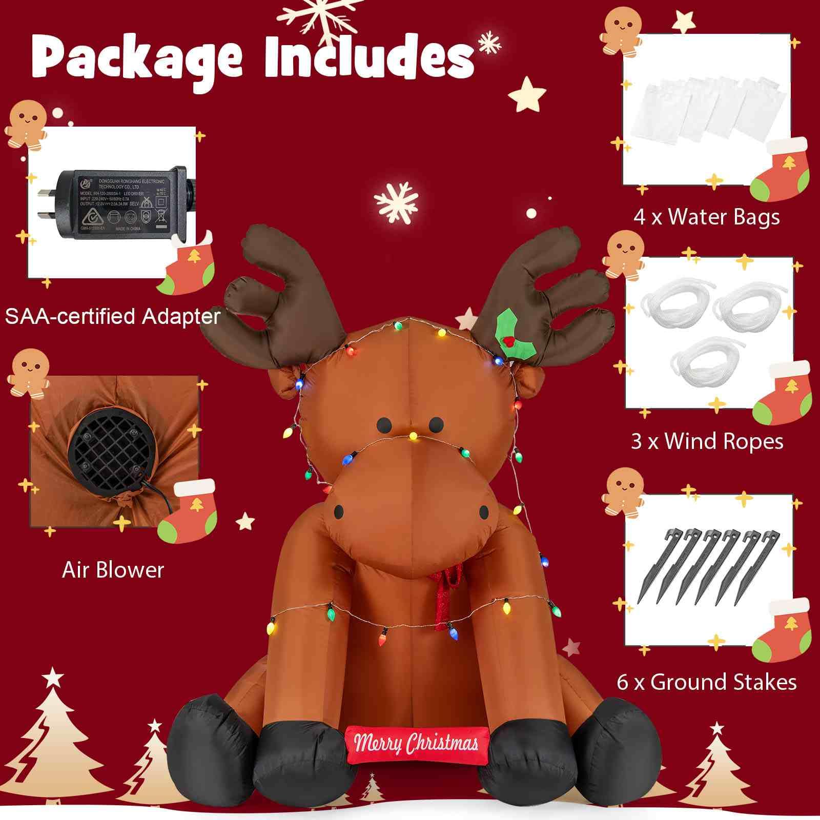 This blow up yard decoration is made of robust 210T polyester fabric, offering IP44 waterproof, snow-proof, and tear-resistant features, along with reinforced stitching for added durability. Additionally, the 24 multicolor, cool-to-touch LED strip lights add a festive glow, complementing the Merry Christmas banner and decorative berry leaves. Stability is never a concern thanks to the included 6 stakes, 3 sturdy wind ropes and 4 water bags. Setting up this decorative reindeer is easy with a SAA-certified adapter, a powerful air blower and a convenient 2.9m power cord.
