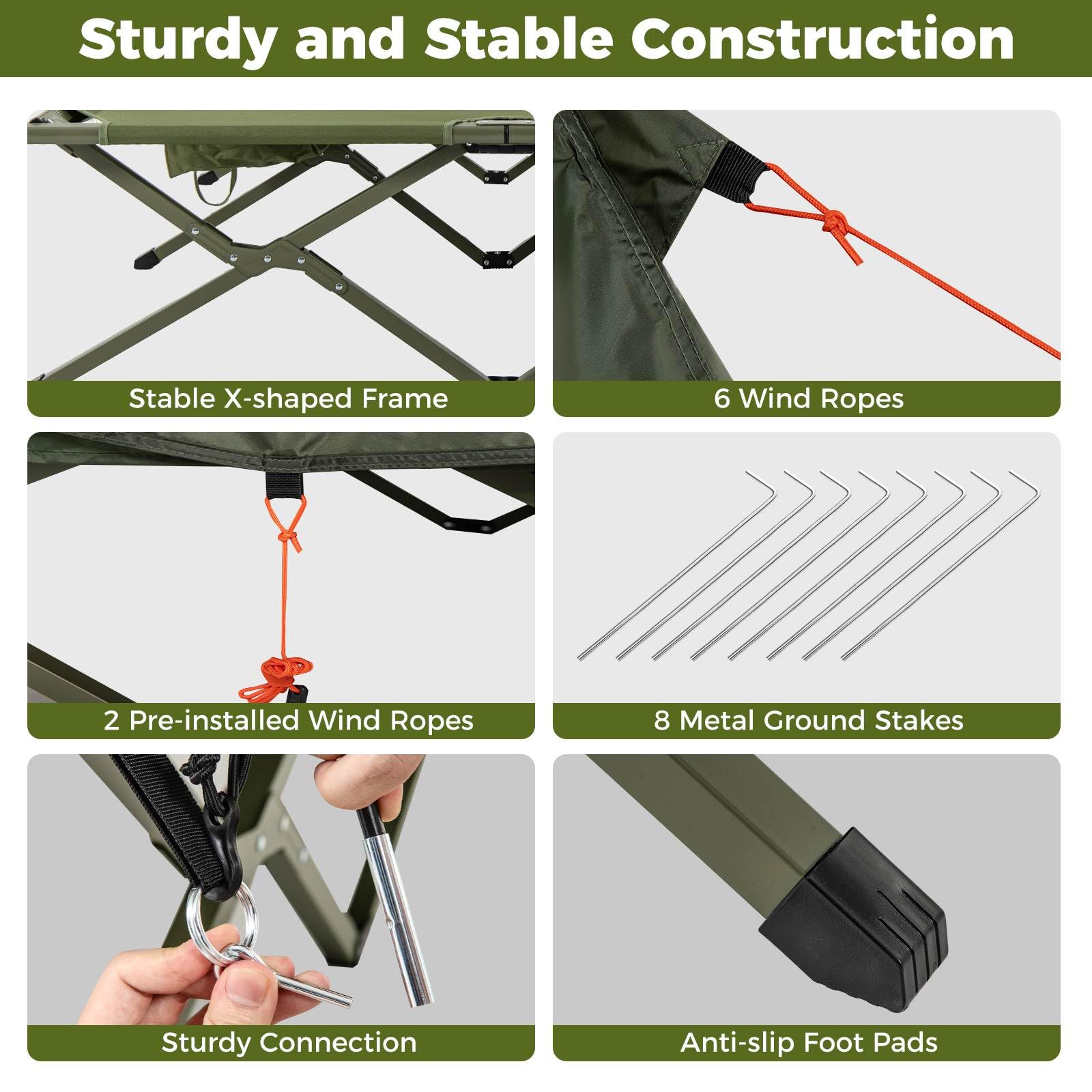 Sturdy and Stable Construction: The tent is equipped with 2 pre-installed wind ropes, 6 wind ropes, 8 metal ground stakes to secure each corner firmly, complete with a stable X-shaped frame, ensuring excellent stability. Plus, it features anti-slip foot pads to prevent sinking into the soft ground.