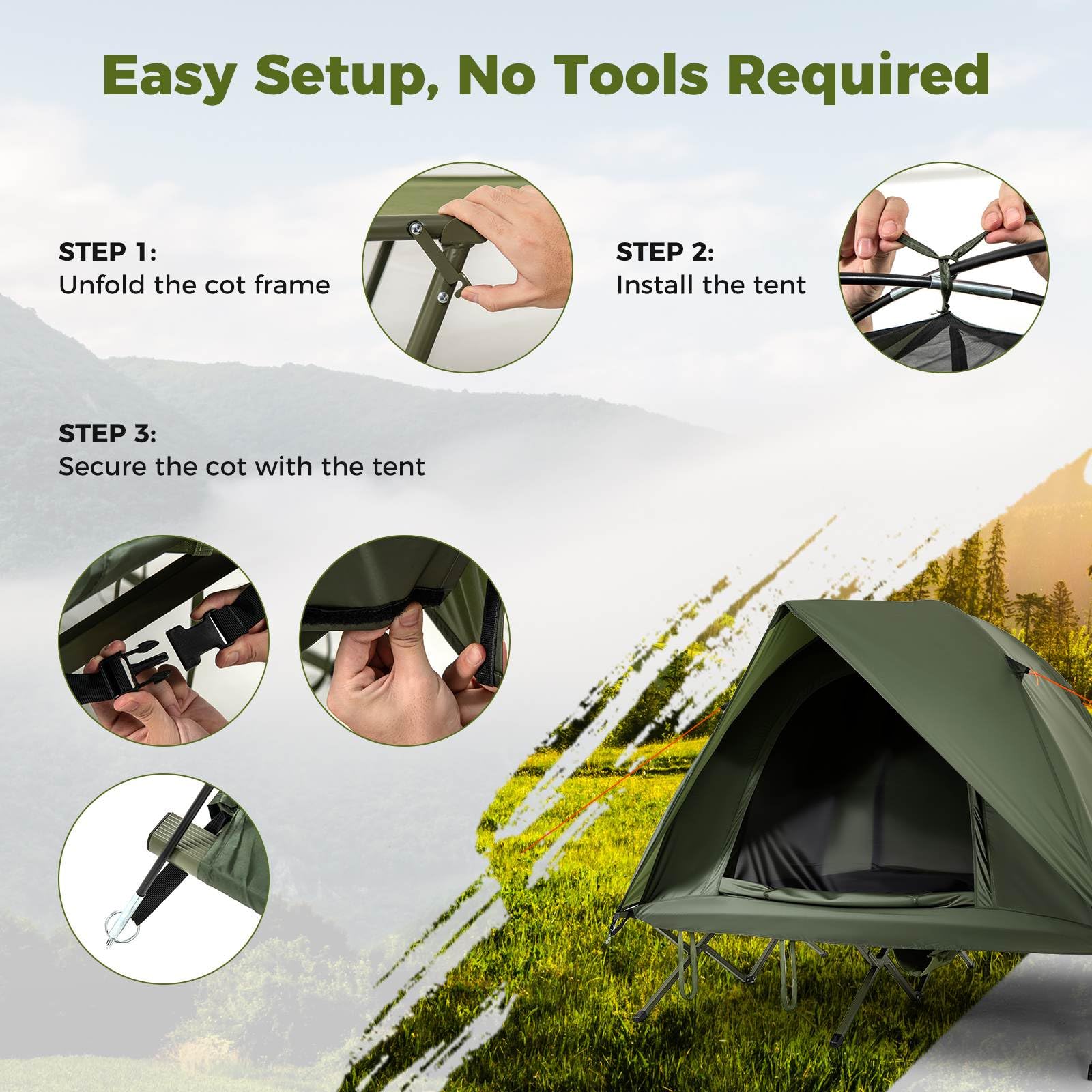 Easy Setup, No Tools Required: The foldable tent boasts a user-friendly that sets up quickly with 2 fiberglass poles and 1 tent canopy, while the cot unfolds easily without any tools. 2 parts are connected securely with buckles and elastic straps, making assembly quick and hassle-free.