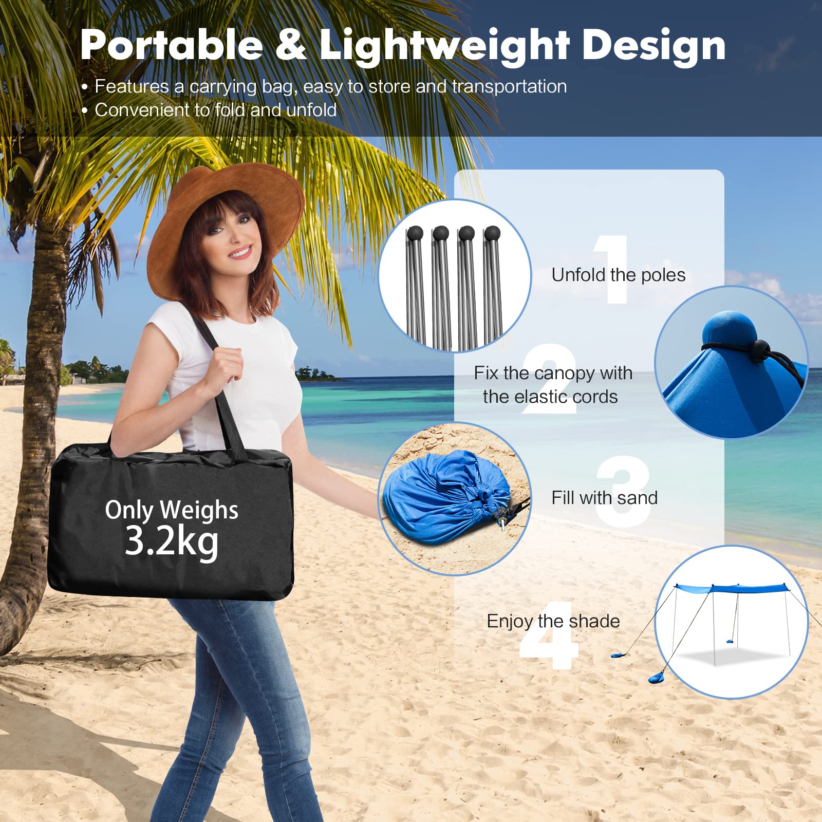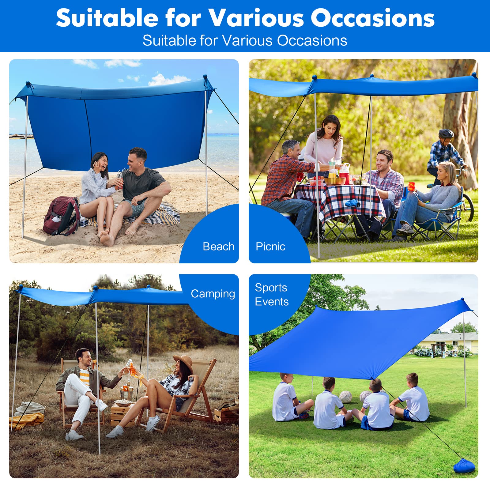Easy Setup: The beach sunshade is easy to set up, and all you need to do is unfold the poles, then fix the canopy with the elastic cords, and then fill it with sand. More than that, you can use all 4 poles to make a taller canopy and creates a bigger usable shade area, or use just 2 poles you can customize a private relaxing sunshade zone with wanted angles.