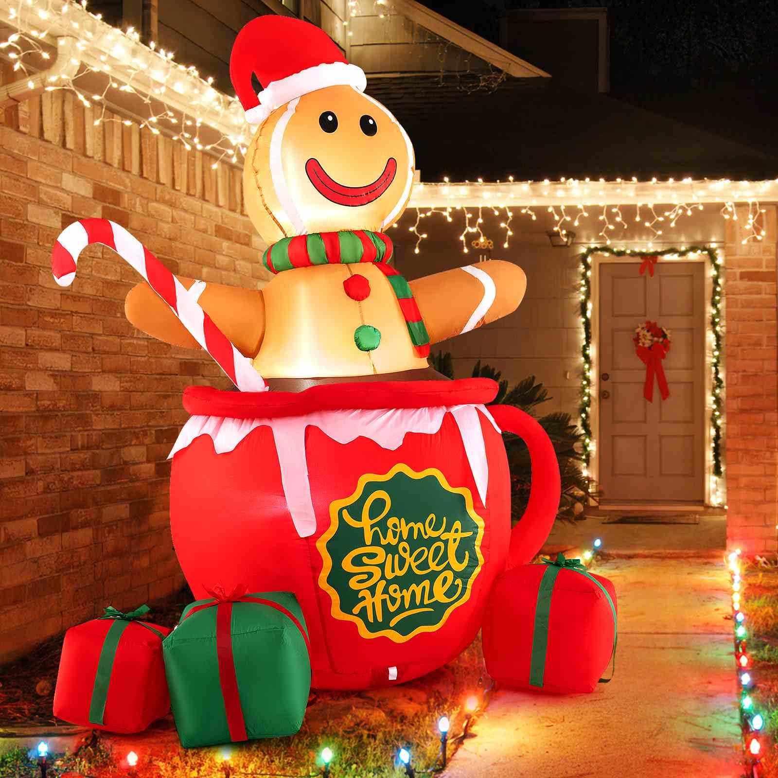 This festive inflatable gingerbread man is an attention-grabbing addition to your outdoor Christmas decoration. With its vibrant LED lighting, it is sure to create a lively holiday atmosphere in your yard or garden. Crafted from all-weather polyester fabric, this Christmas inflatable is built to last. Quick and easy to inflate with the included powerful blower, this blow up Christmas decoration stands stably with the sandbag, fixing ties and ground stakes. The gingerbread man sits in a hot cocoa mug and holds a candy cane, adding a delightful touch to your outdoor space and bringing festive spirit to all who see it.