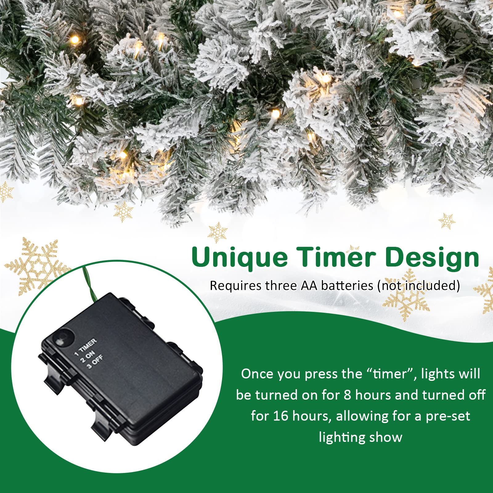 Composed of 140 PVC branch tips, the holiday rattan and wreath perform a vibrant appearance while gaining better fire and fade resistance. Press the "on" button and LED lights will be turned on to glow warm white. If you press the "timer" button, the Christmas rattan will emit warm white lighting for 8 hours and then be turned off for 16 hours. By the way, the IP44 battery box needs three batteries which are not included. Finally, Christmas rattan can be used alone or in combination to suit different occasions, such as fireplaces, doorways, stairs, etc.