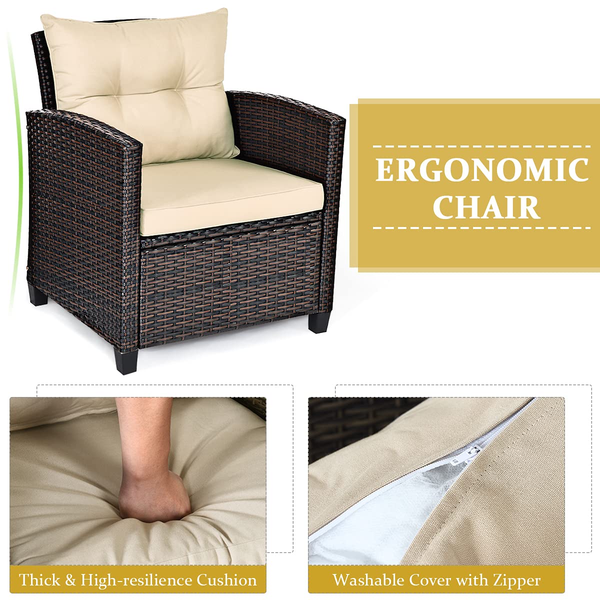 3 Pieces Patio Furniture Set PE Rattan Wicker Outdoor Sofa Set w/Washable Cushion and Tempered Glass Tabletop