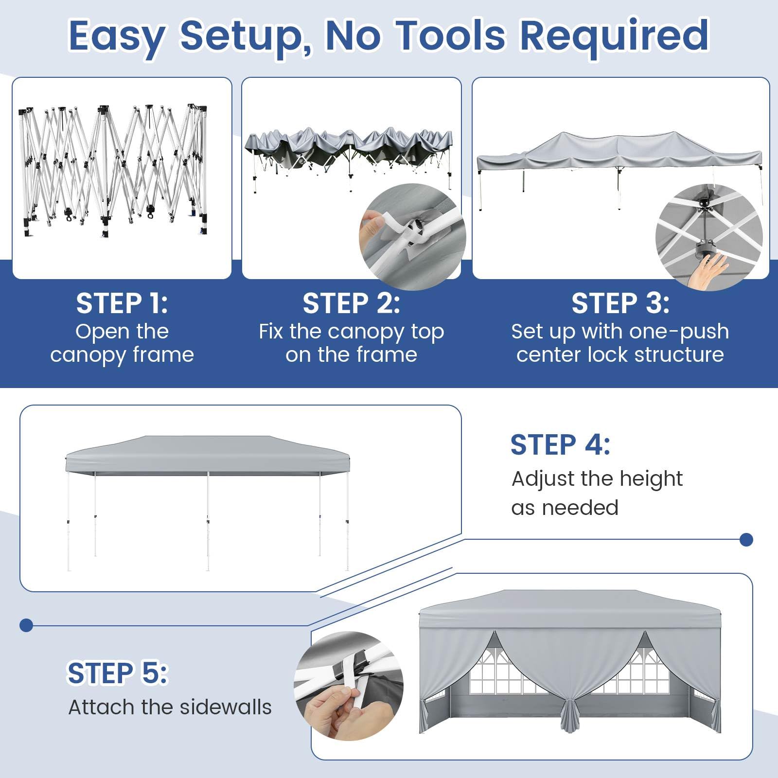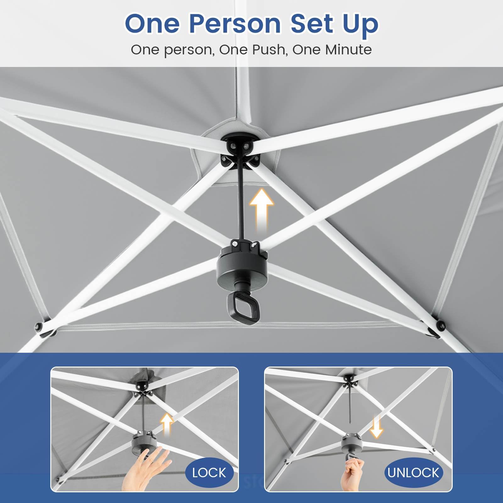 Easy One-Hand Setup with Center Locks: This 300 x 600 cm pop up canopy tent features an innovative one-hand center lock system, making it easy and effortless to secure or release the trusses without the hassle of locking and unlocking the canopy leg sliders. Its pop up structure ensures easy set up, no tools required.