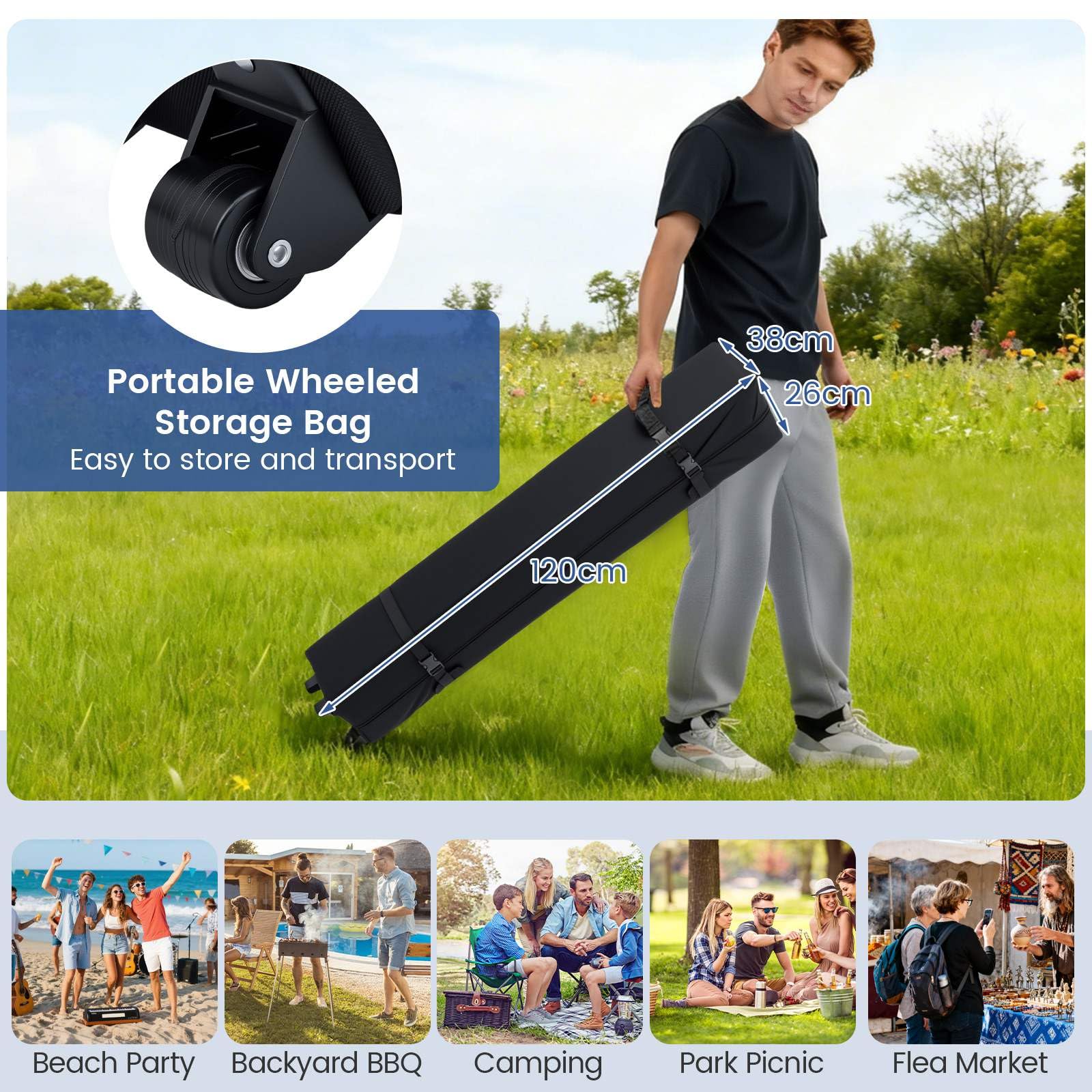 Spacious Coverage: Occupying a generous 300 x 600 cm area, this canopy comfortably accommodates large gatherings or commercial displays, paired with a 3-level adjustable height (250/260/270 cm), meeting different venue requirements and preferences. Additionally, it includes a portable wheeled storage bag, making it effortless to transport and store.
