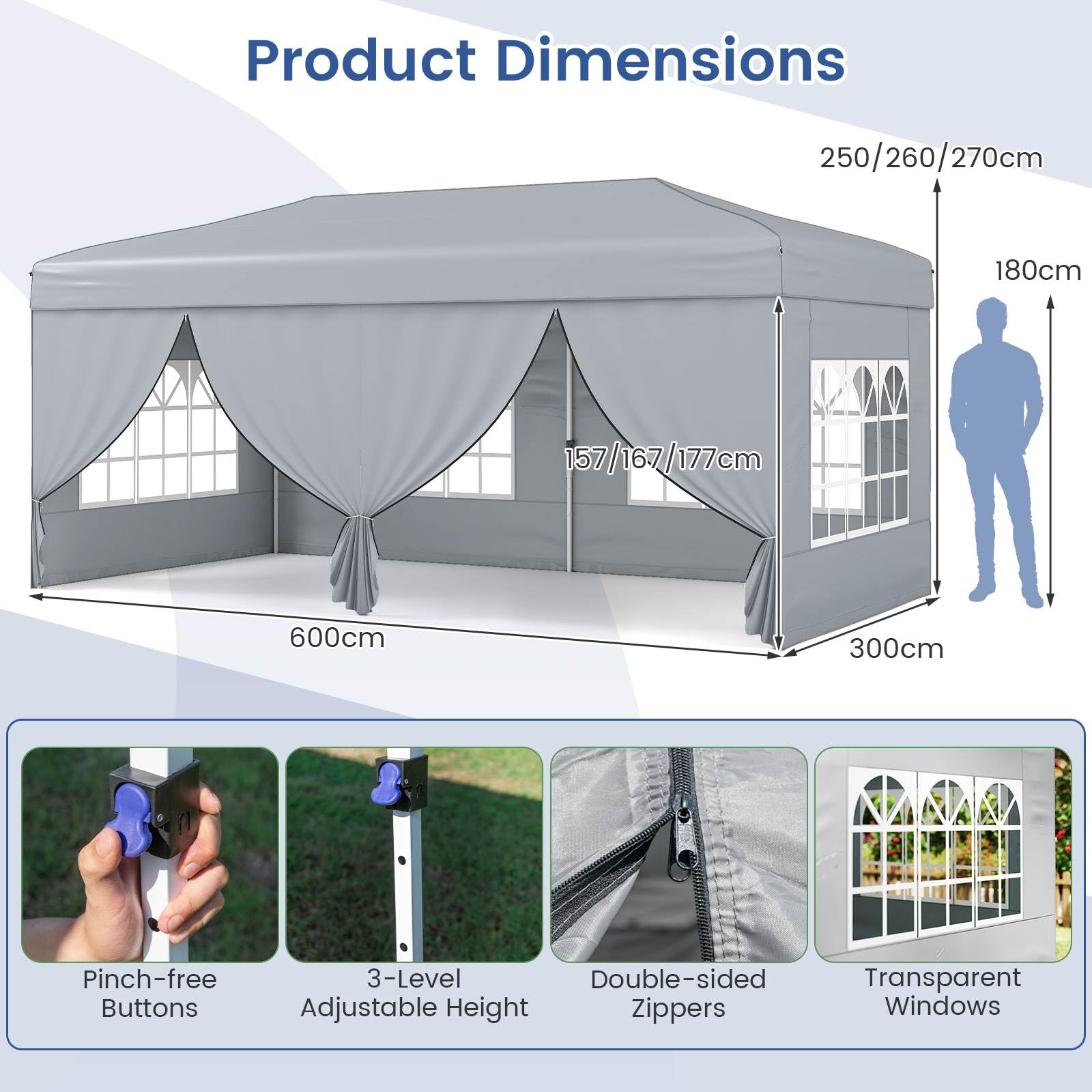 Our foldable and portable outdoor canopy tent measures 300 x 600 x 250-270 cm (L x W x H), offering a premium solution for outdoor shade, gatherings, and events. Thanks to an advanced one-hand center lock system, you can set up or take down the sturdy carbon steel frame effortlessly, saving time and energy. The included set of zippered and windowed sidewalls can be arranged in any combination, letting you easily adapt privacy and airflow for occasions like parties, weddings, or market booths. Engineered for reliability, the reinforced truss structure, additional wind ropes, ground stakes, and sandbags ensure solid anchoring for stability in changing weather. The canopy's Oxford cloth with a silver coating delivers UPF50+ sun protection, and meets flame resistance safety standards - making it a dependable choice for both sunny and drizzly days. Height adjustments can be made quickly with pinch-free buttons, and the entire tent conveniently fits in a wheeled storage bag, making transport and storage straightforward whether you're at home, the park, or on the go.