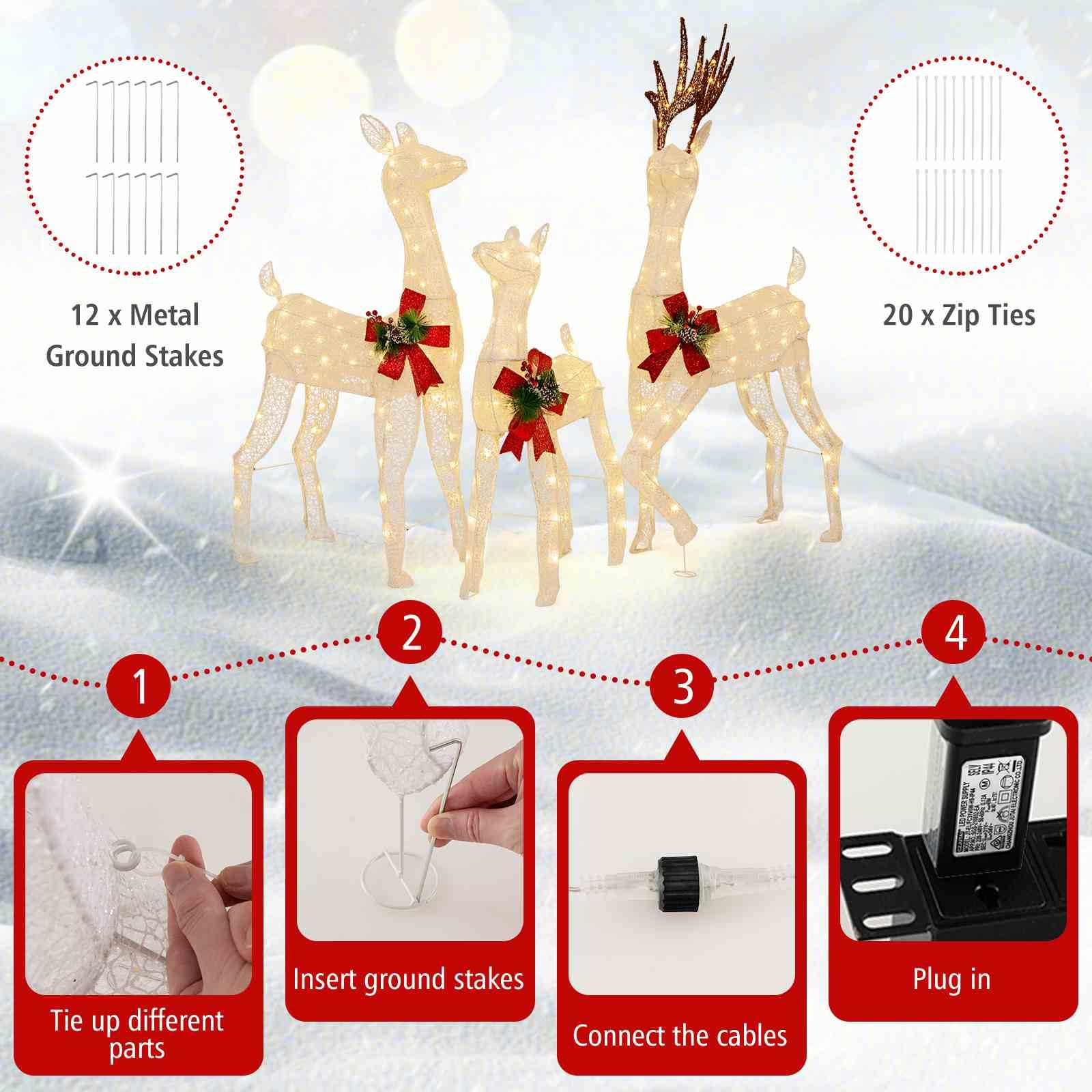 230 Warm Color Lights: Coming with 230 pre-lit led lights, the Christmas reindeer family set is easy to illuminate your home. What’s more, the warm color glow brings warmth to your family and increases cosy ambiance.