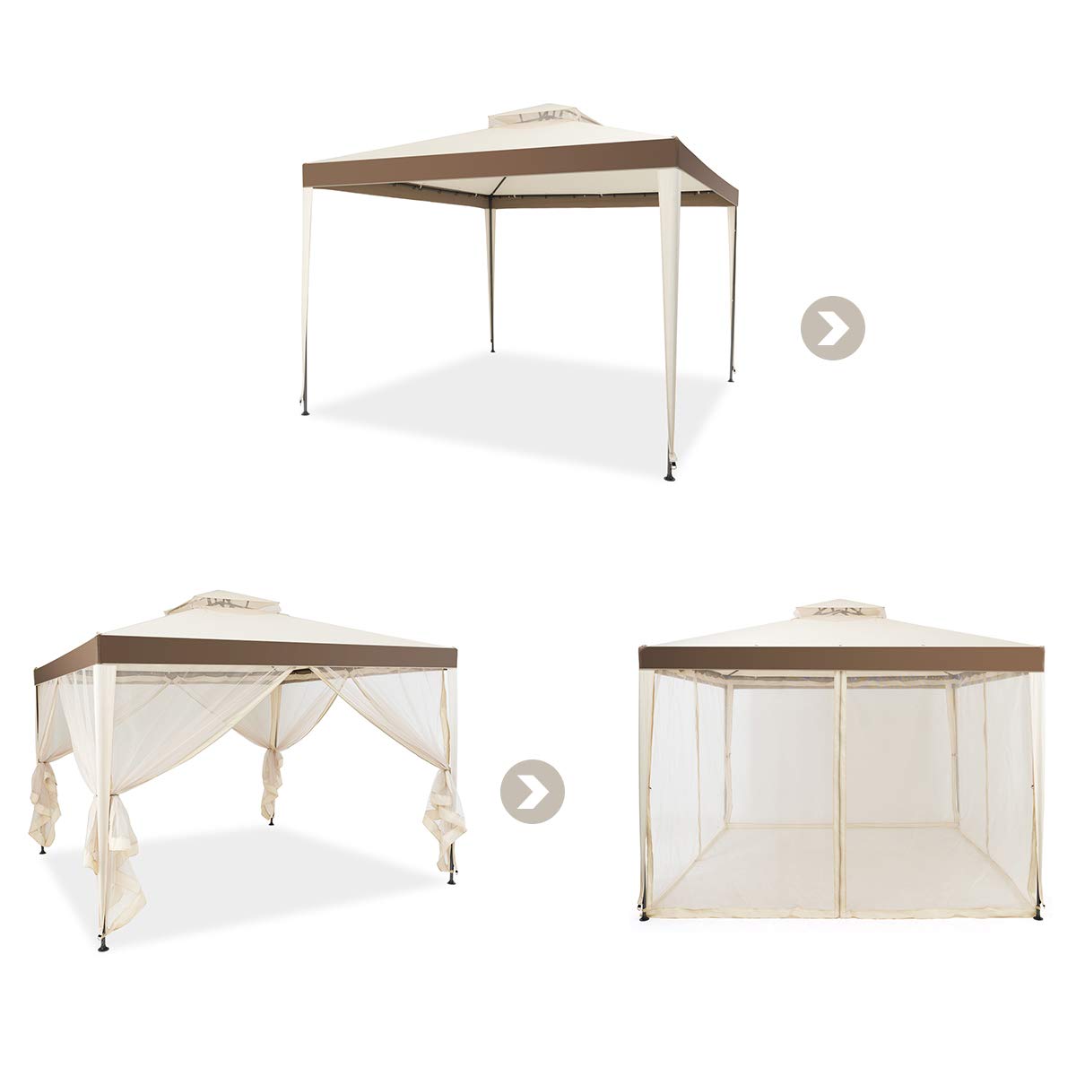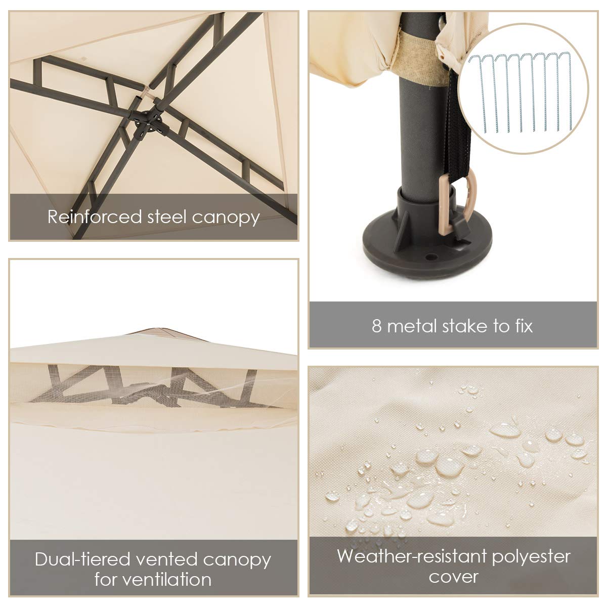 Meticulous Design: Our gazebo canopy is designed with a double-tier roof, which keeps airflow adequate but keeps rain and winds out. Meanwhile, the extended top fabric cover with grommets helps ensure proper water drainage. It will keep you cool when relaxing in the summer and preserve your shelter for seasons to come.