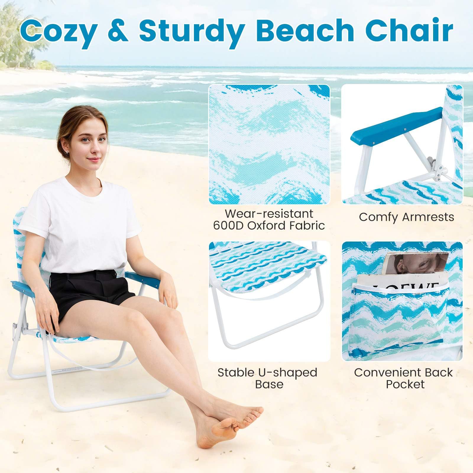 Comfy Chairs for Camping: These beach chairs boast wide armrests and an angled backrest for superior comfort, complemented by a storage pocket on the backrest to neatly store essentials like smartphones, beverages, snacks or books.