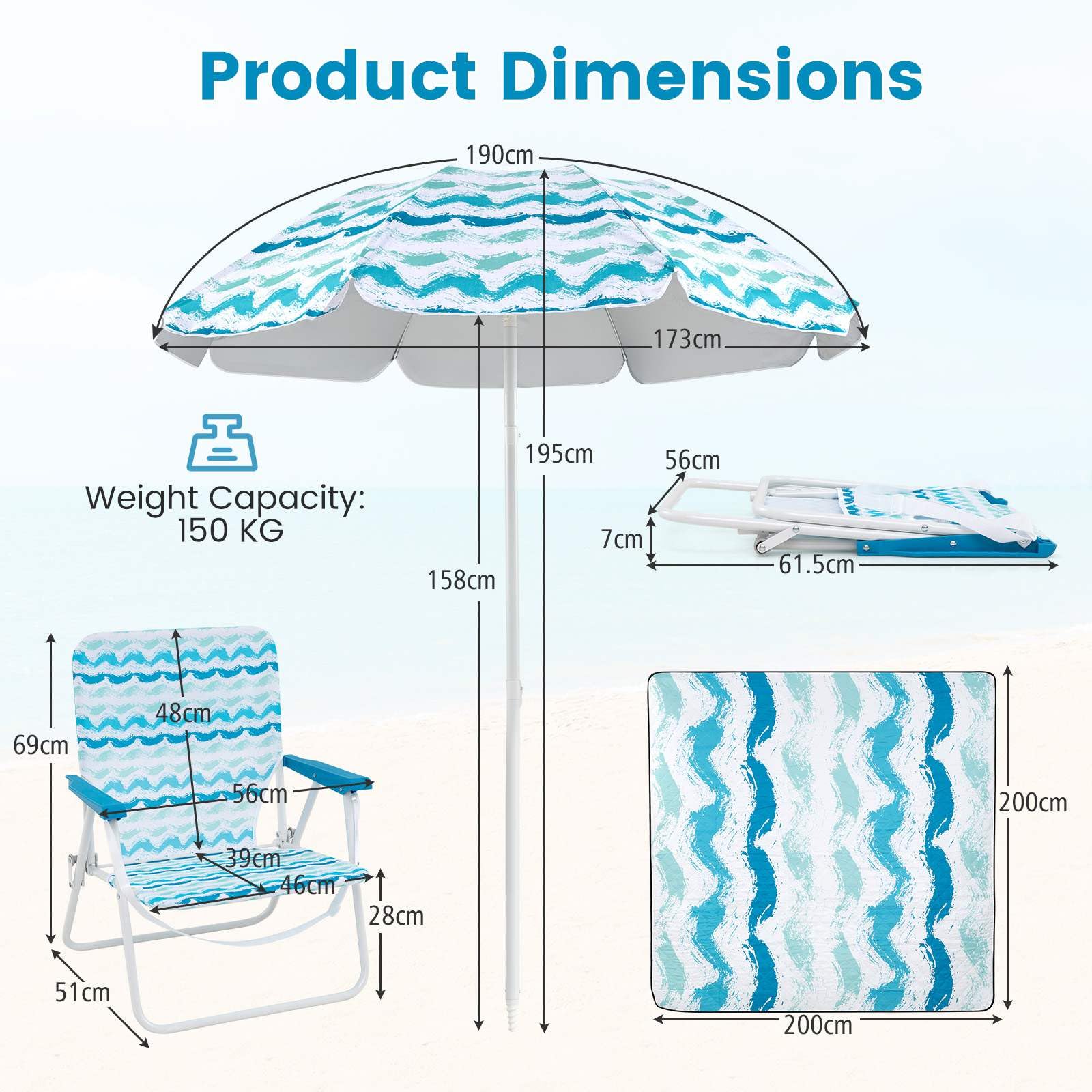 Complete 4 Pieces Beach Set: This comprehensive set features a 1.9 m beach umbrella, 2 folding chairs measuring 56 x 51 x 69 cm (L x W x H), and a large 2 x 2 m beach blanket, configurable in multiple layouts that suit any family outing or social gathering.