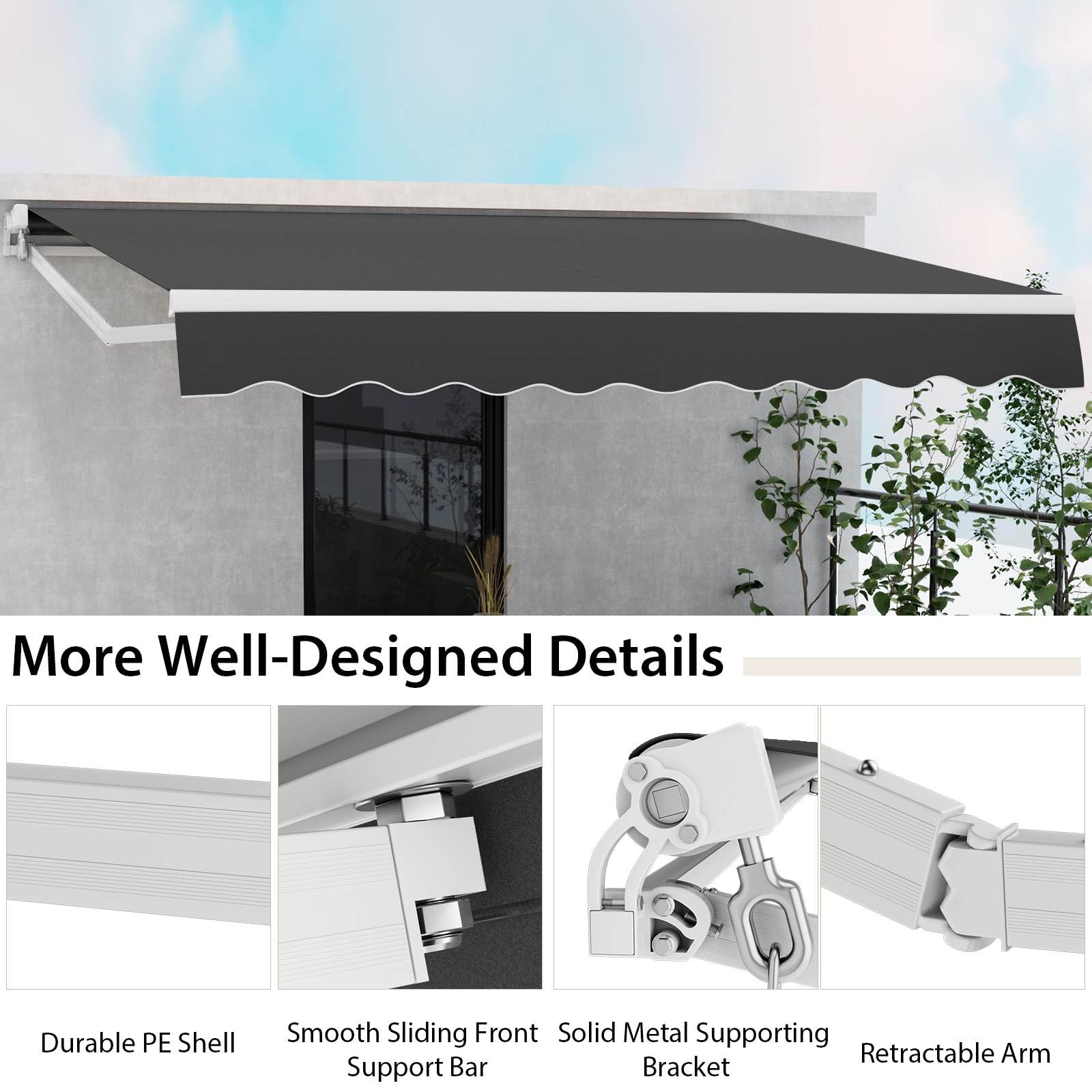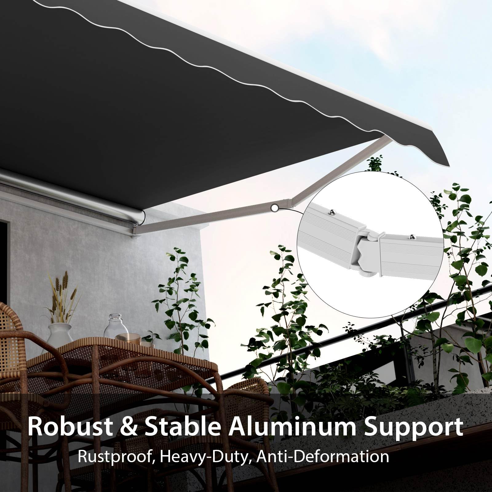 Robust and Stable Construction: The solid metal frame and aluminum alloy components of this awning provide a strong and durable structure. Reinforced metal support bracket enhances overall stability. Whether it's a windy day or a sunny afternoon, this awning will stand strong.