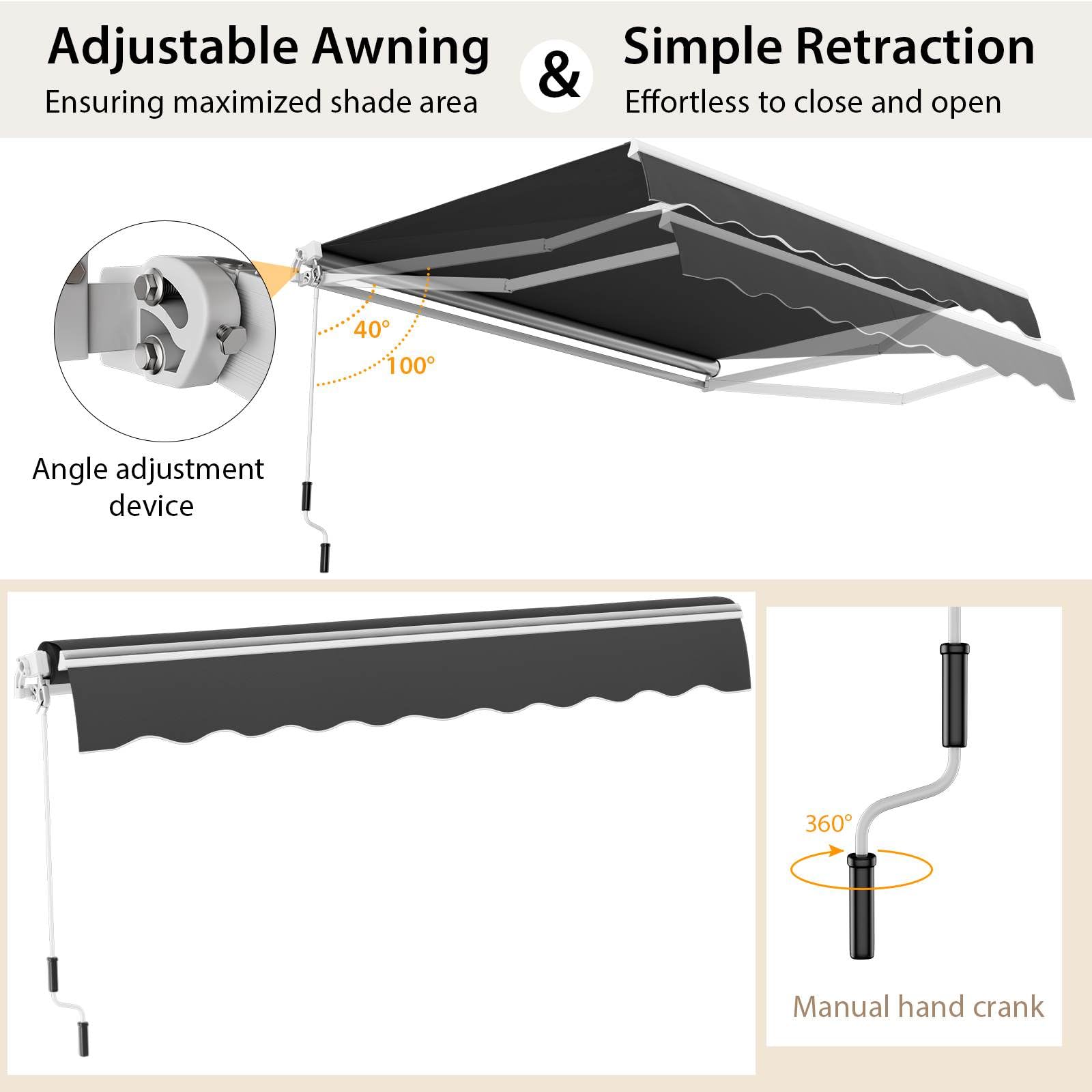 Customize Your Shade: Made from premium polyester fabric that is sun, fade and tear resistant, this retractable awning is adjustable from 40° to 100° for your maximum comfort, making it easy to create the perfect shady spot for relaxation and gatherings.