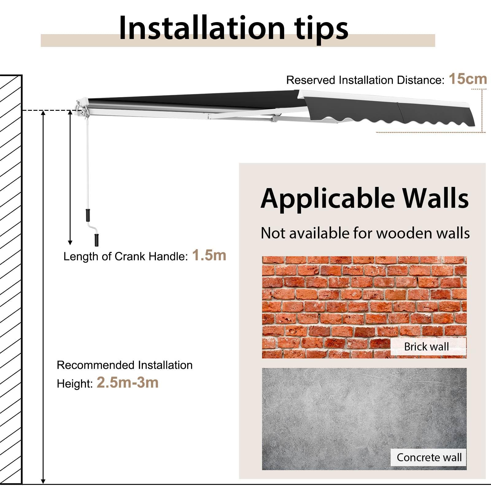 Installation Instructions: Complete with detailed instructions and all necessary accessories, this outdoor awning with crank can be easily assembled on concrete or brick walls(not suitable for installation on wooden walls). The recommended installation height is 250 cm-300 cm.